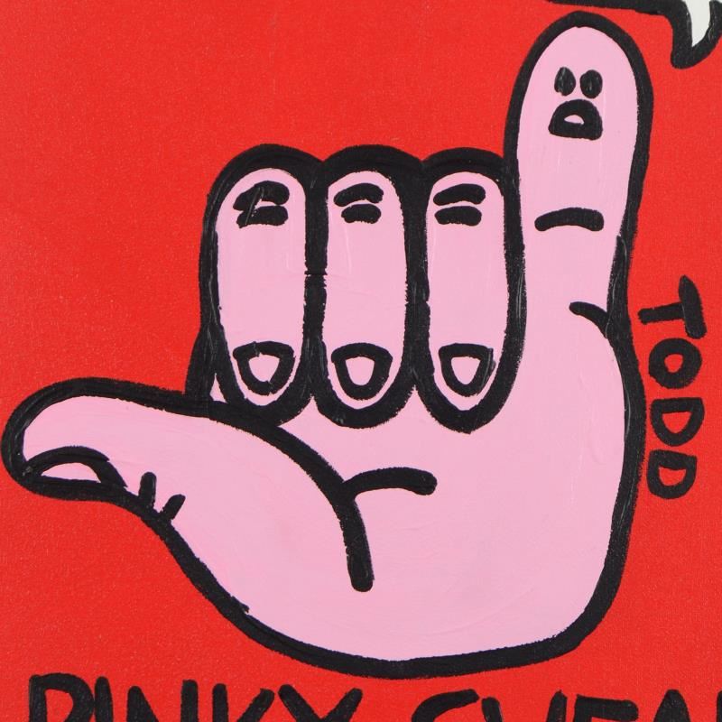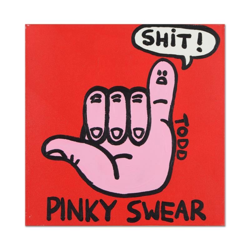 We acquired this piece as part of a larger collection. We do not approve of its inappropriate content. "Pinky Swear" is an original acrylic painting on canvas by Todd Goldman, hand signed by the artist. This piece comes gallery wrapped. Includes Certificate of Authenticity. Measures approx. 24" x 24" (image). Please note: There is wear on the corners and edges of this piece.