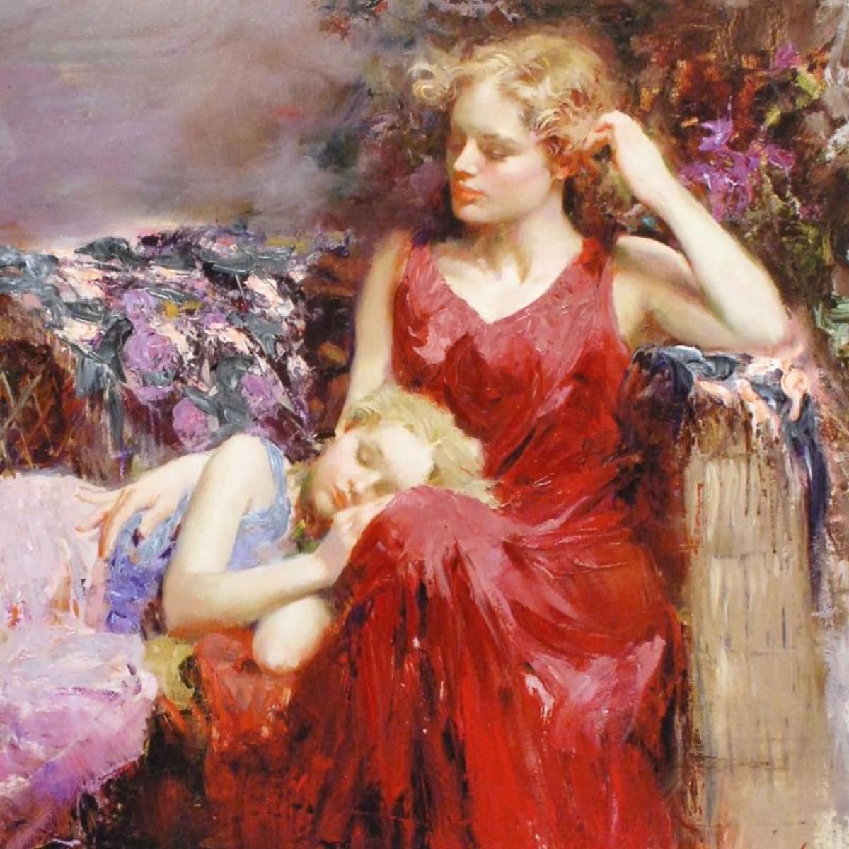 "A Mother's Love" is a limited edition giclee on canvas by Pino (1931-2010), numbered and hand signed by the artist. Includes Certificate of Authenticity. Measures approx. 16" x 12" (image).
