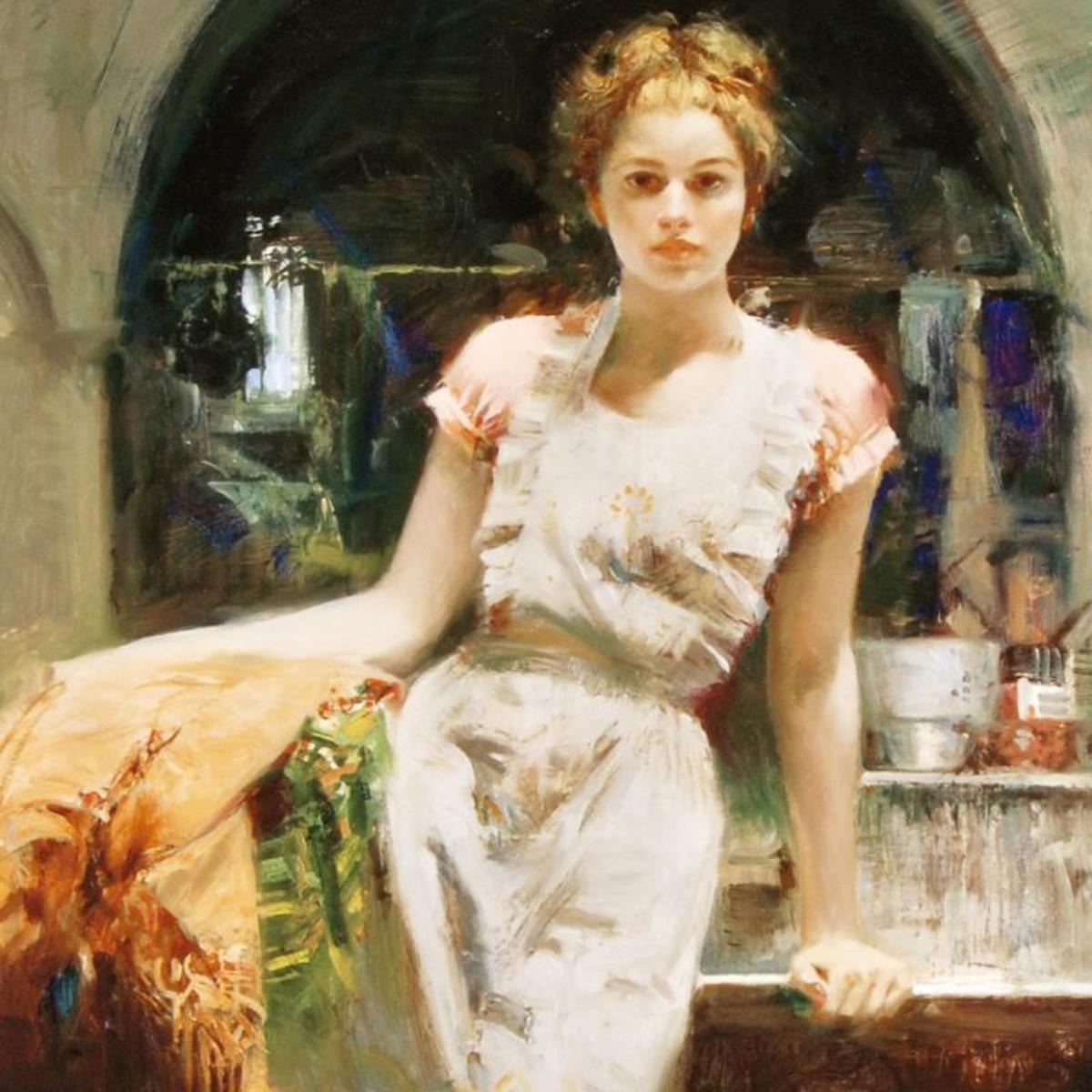 "In the Glow" is a limited edition giclee on canvas by Pino (1931-2010), numbered and hand signed by the artist. Includes Certificate of Authenticity. Measures approx. 12" x 20" (image).