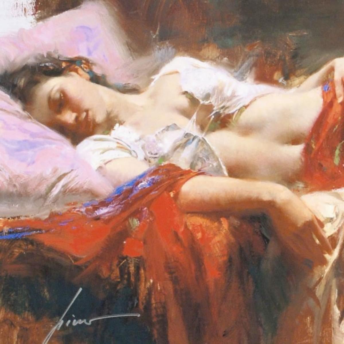 "Restful" is a limited edition giclee on canvas by Pino (1931-2010), numbered and hand signed by the artist. Includes Certificate of Authenticity. Measures approx. 20" x 12" (image).