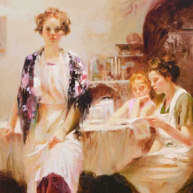"Distant Thoughts" is an artist embellished limited edition giclee on canvas by Pino (1939-2010), AP Numbered and hand signed by the artist. Includes Certificate of Authenticity. Measures approx. 36" x 40" (image). This piece is not stretched.