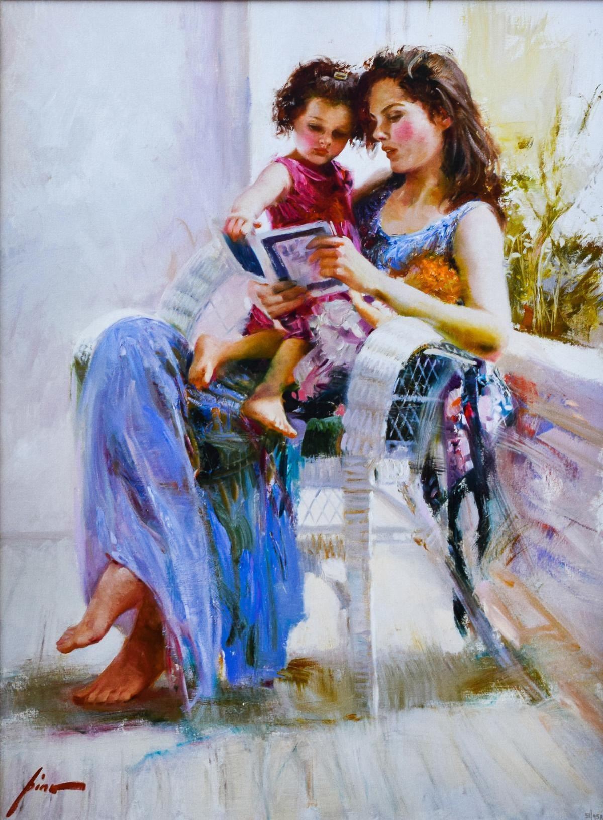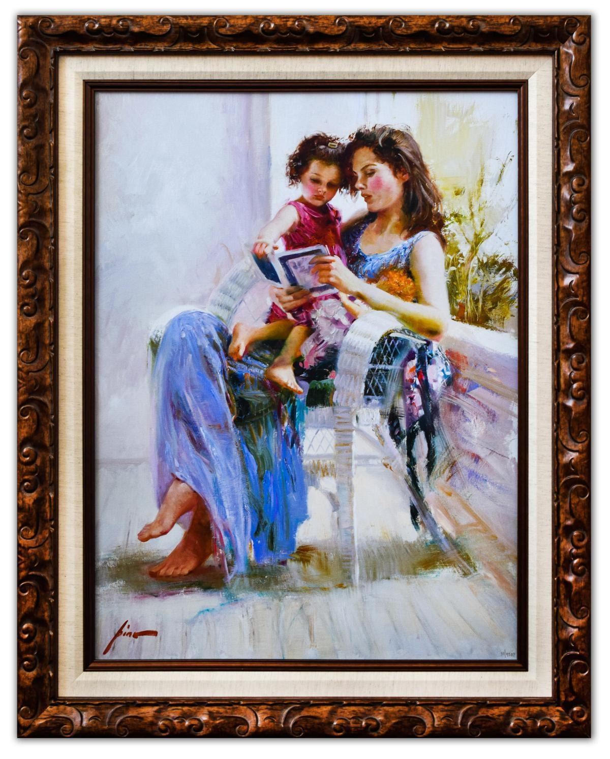 Artist: Pino (1939-2010). Medium: Hand Embellished Giclee on Canvas. Title: Book of Poems. Size (Unframed): 32" x 24". Size (Framed): 40" x 32". Certificate of Authenticity: From the publisher . Additional: Custom framed , Pino's portraits allow glimpses into intensely personal, intimate spaces, conveying emotion through rich, warm color and sensual brushwork. "Sweet Love" is an artist-embellished limited edition giclee on canvas by Pino (1939-2010).. Reference# 15446.