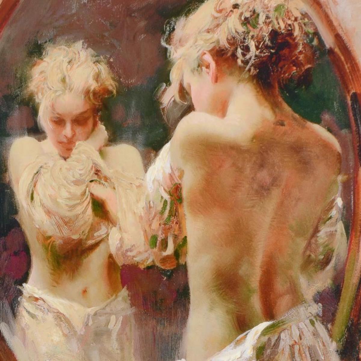 Artist: Pino (1939-2010). Medium: Hand Embellished Giclee on Canvas. Title: Contemplation. Size (Unframed): 30" x 24". Limited Edition: Hand Signed and Numbered. Certificate of Authenticity: From the publisher. Additional: Pino's portraits allow glimpses into intensely personal, intimate spaces, conveying emotion through rich, warm color and sensual brushwork. "Contemplation" is an artist-embellished limited edition giclee on canvas by Pino (1939-2010).. Reference# 13508.