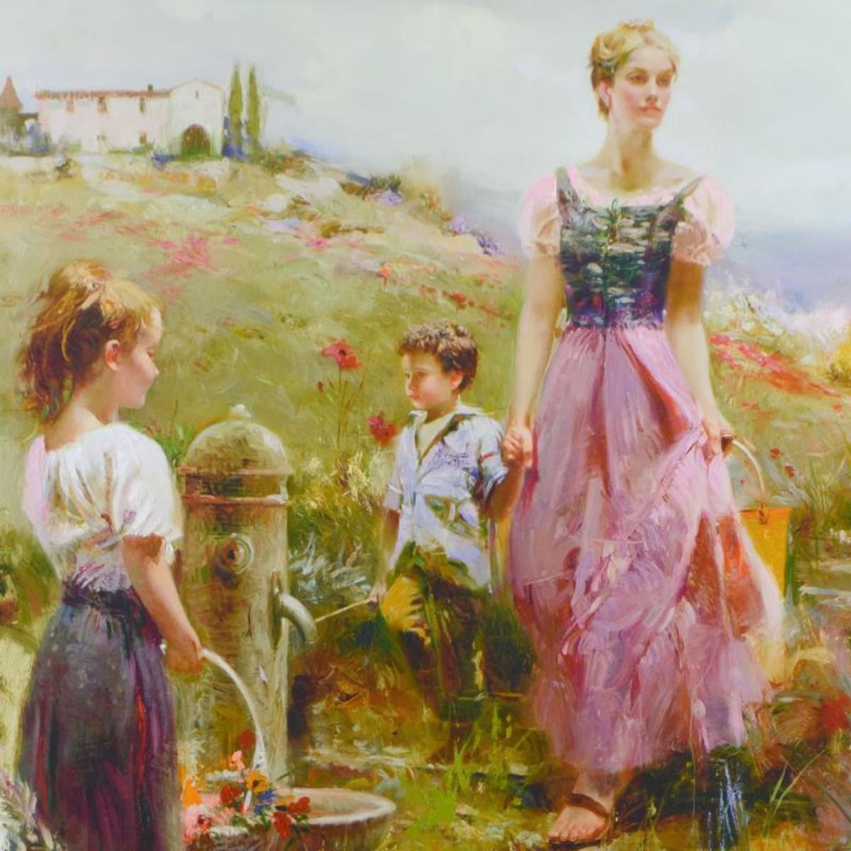 Artist: Pino (1939-2010). Medium: Hand Embellished Giclee on Canvas. Title: The Fountain of Life. Size (Unframed): 40" x 32". Limited Edition: Hand Signed and Numbered. Certificate of Authenticity: From the publisher. Additional: Pino's portraits allow glimpses into intensely personal, intimate spaces, conveying emotion through rich, warm color and sensual brushwork. "The Fountain of Life" is an artist-embellished limited edition giclee on canvas by Pino (1939-2010).. Reference# 13520.