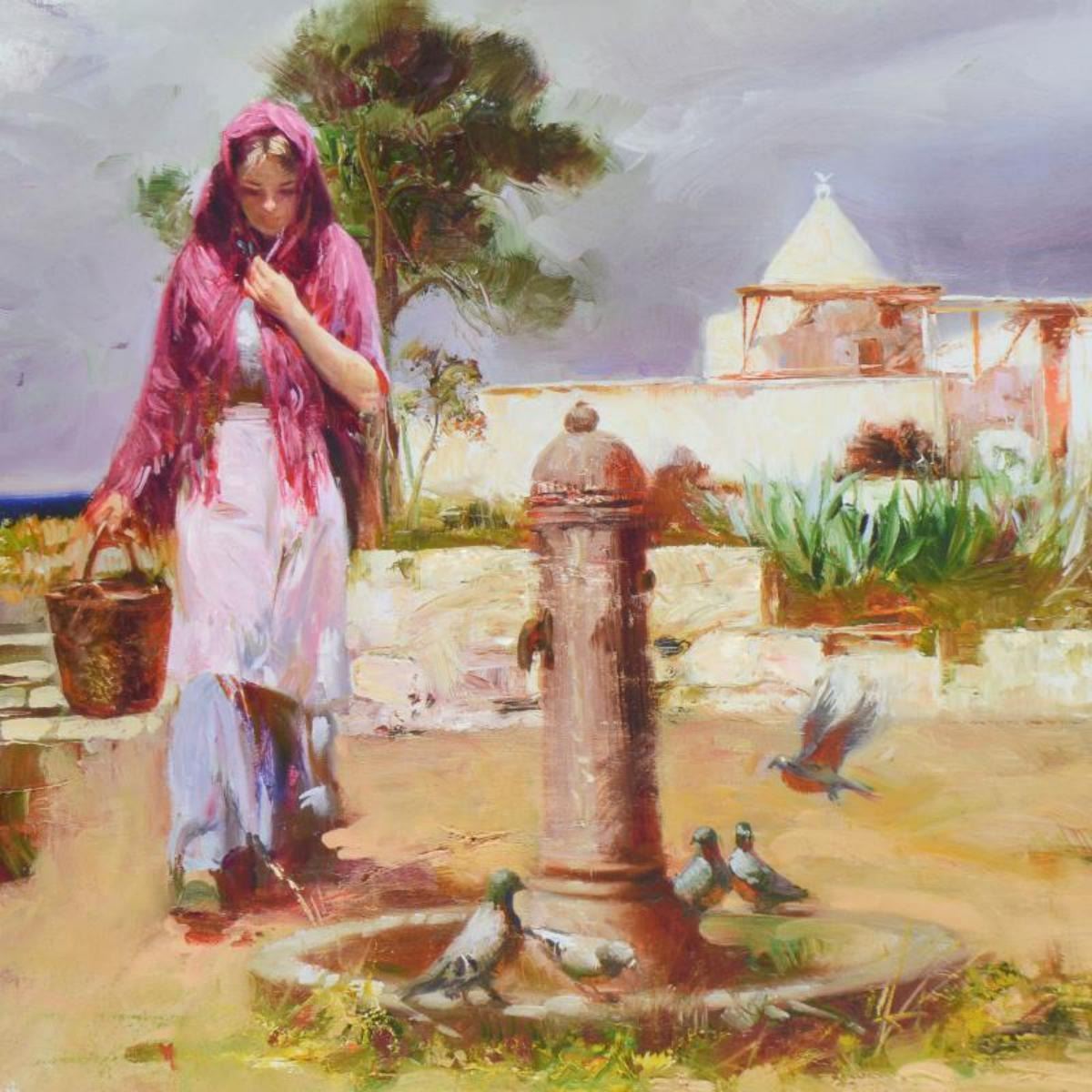 Artist: Pino (1939-2010). Medium: Hand Embellished Giclee on Canvas. Title: The Water Fountain. Size (Unframed): 30" x 40". Limited Edition: Hand Signed and Numbered. Certificate of Authenticity: From the publisher. Additional: Pino's portraits allow glimpses into intensely personal, intimate spaces, conveying emotion through rich, warm color and sensual brushwork. "The Water Fountain" is an artist-embellished limited edition giclee on canvas by Pino (1939-2010).. Reference# 13521.