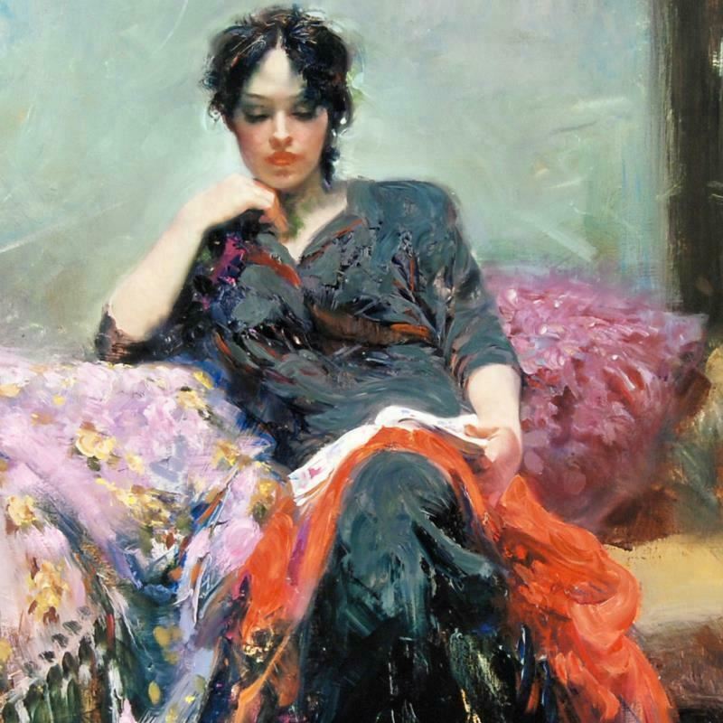 "Her Favorite Book" is an artist embellished limited edition giclee on canvas by Pino (1939-2010), PP Numbered and hand signed by the artist. Includes Certificate of Authenticity. Measures approx. 30" x 40" (image). This piece is not stretched.