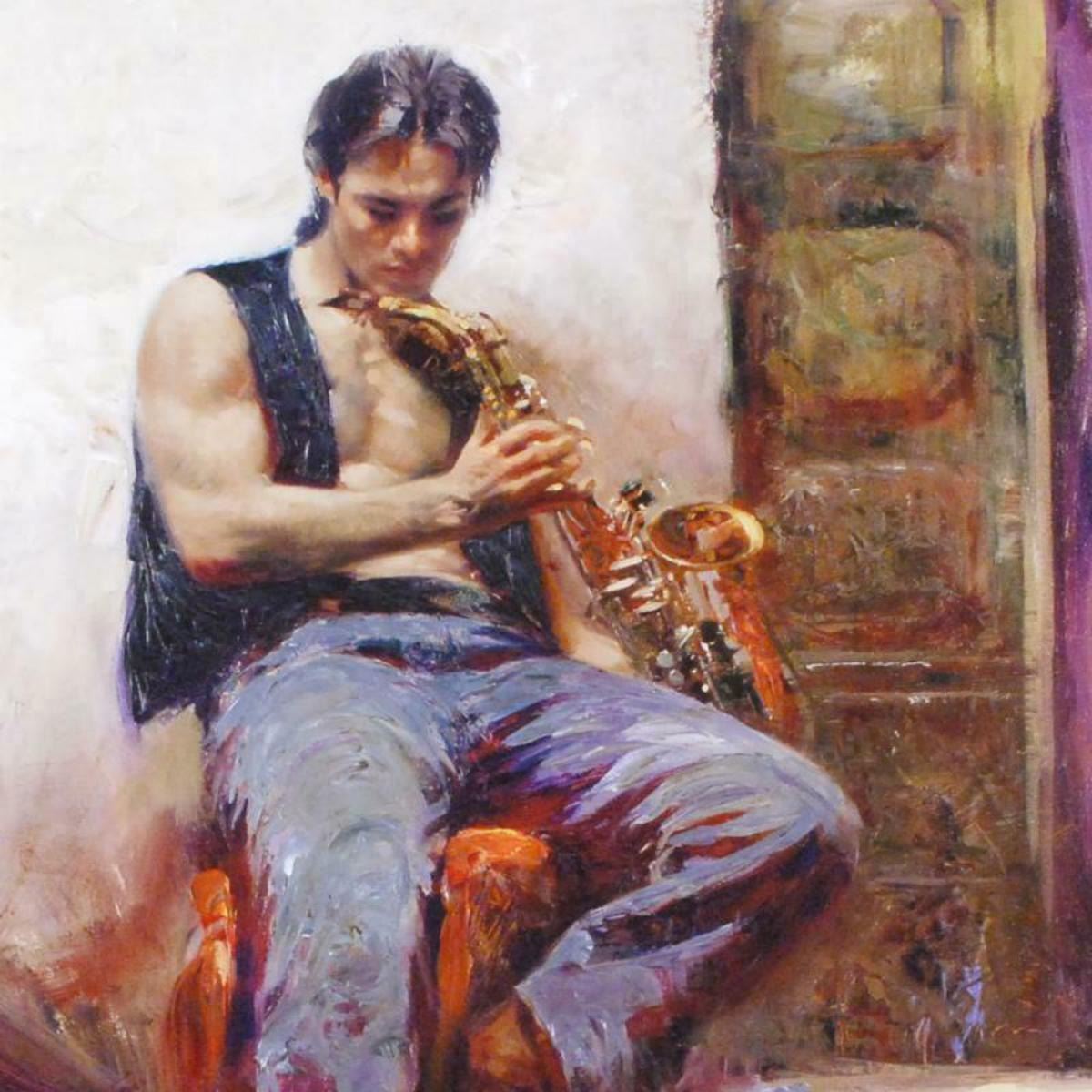 "Music Lover" is an artist embellished limited edition giclee on canvas by Pino (1939-2010), CP Numbered and hand signed by the artist. Includes Certificate of Authenticity. Measures approx. 24" x 30" (image). This piece is not stretched. Reference #: 253565