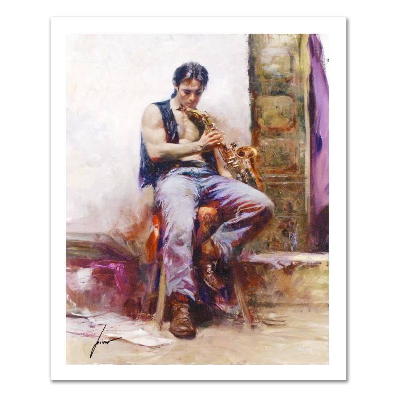 "Music Lover" is a limited edition giclee on canvas by Pino (1939-2010), numbered and hand signed by the artist. Includes Certificate of Authenticity. Measures approx. 14" x 18" (image).