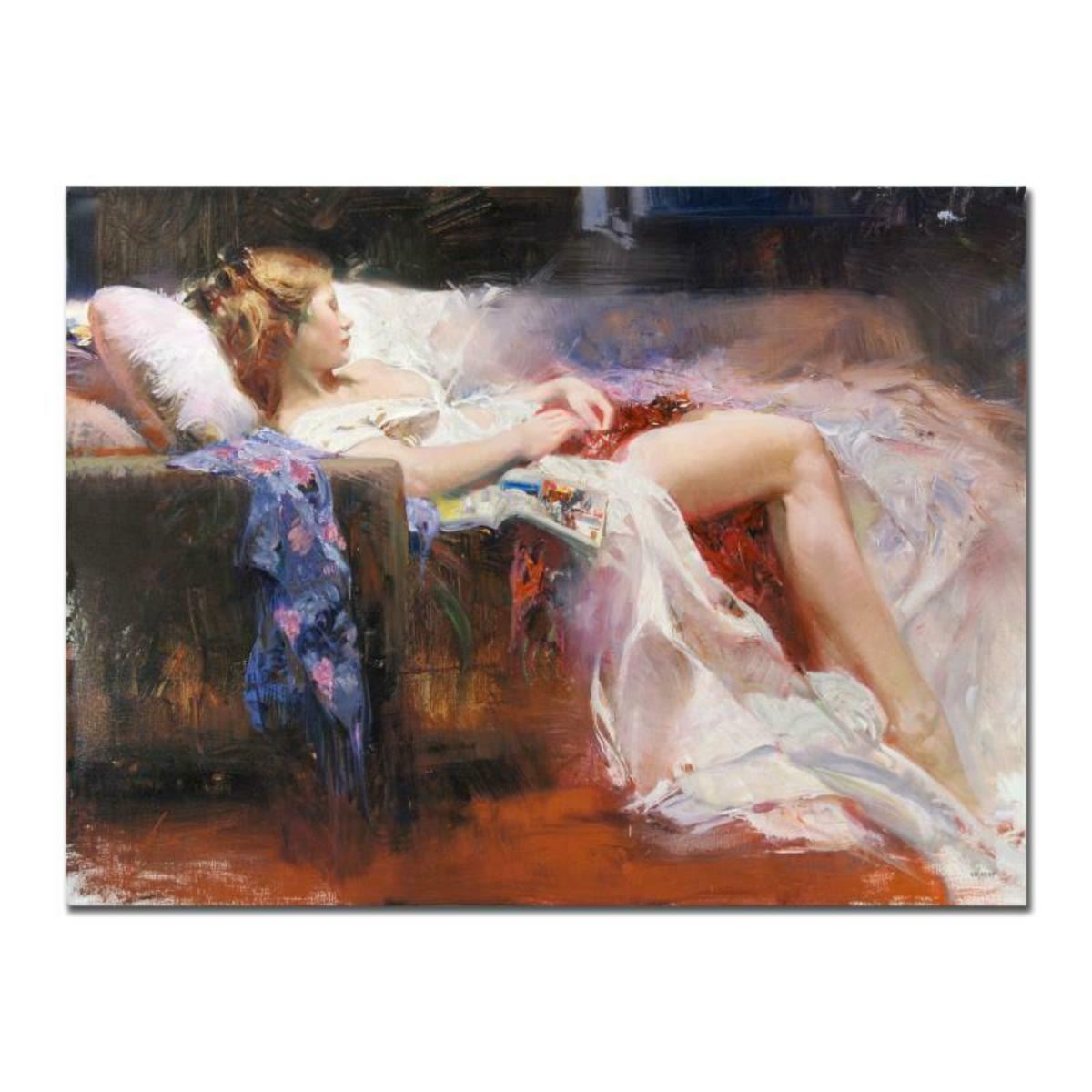 "Sweet Repose" is an artist embellished limited edition giclee on canvas by Pino (1939-2010), AP Numbered and hand signed by the artist. Includes Certificate of Authenticity. Measures approx. 40" x 30" (image). This piece is not stretched. Reference #: 253499