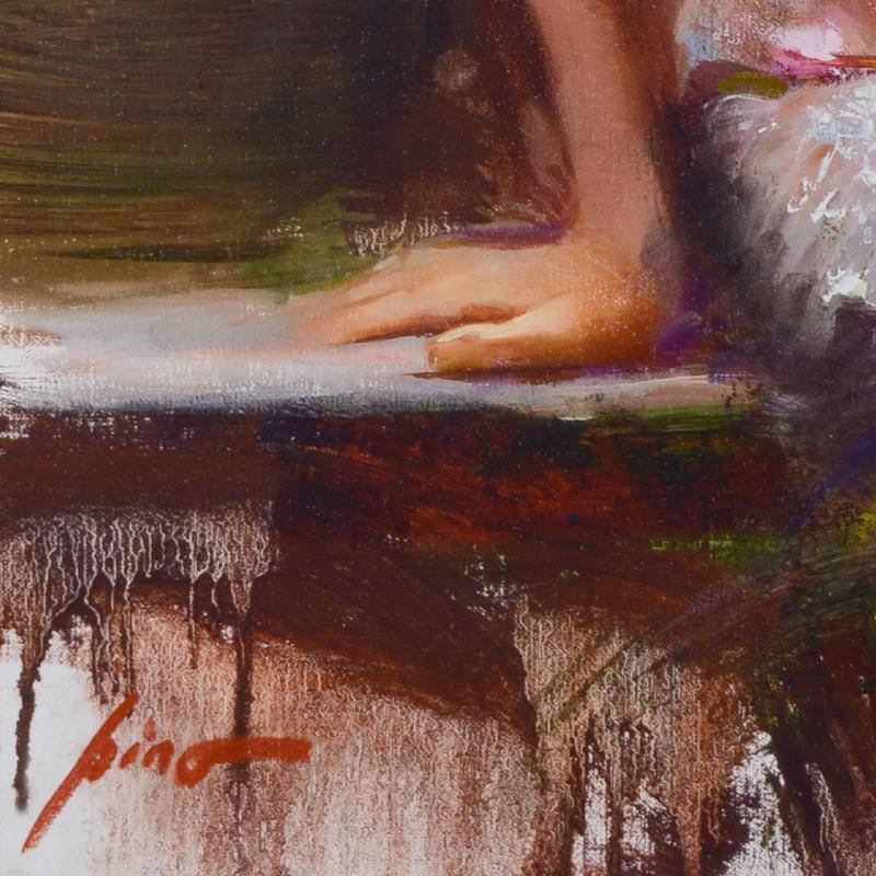 Pino's portraits allow glimpses into intensely personal, intimate spaces, conveying emotion through rich, warm color and sensual brushwork. "Sweet Scent" is an artist-embellished limited edition giclee on canvas by Pino (1939-2010). The piece is numbered, hand signed, and includes certificate of authenticity. Measures approximately 26" x 20" (image).