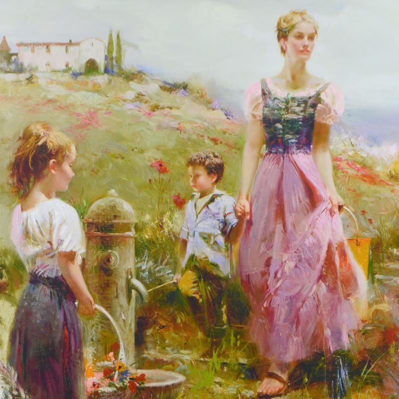 Pino's portraits allow glimpses into intensely personal, intimate spaces, conveying emotion through rich, warm color and sensual brushwork. "The Fountain of Life" is an artist-embellished limited edition giclee on canvas by Pino (1939-2010). The piece is numbered, hand signed, and includes certificate of authenticity. Measures approximately 40" x 32" (image).