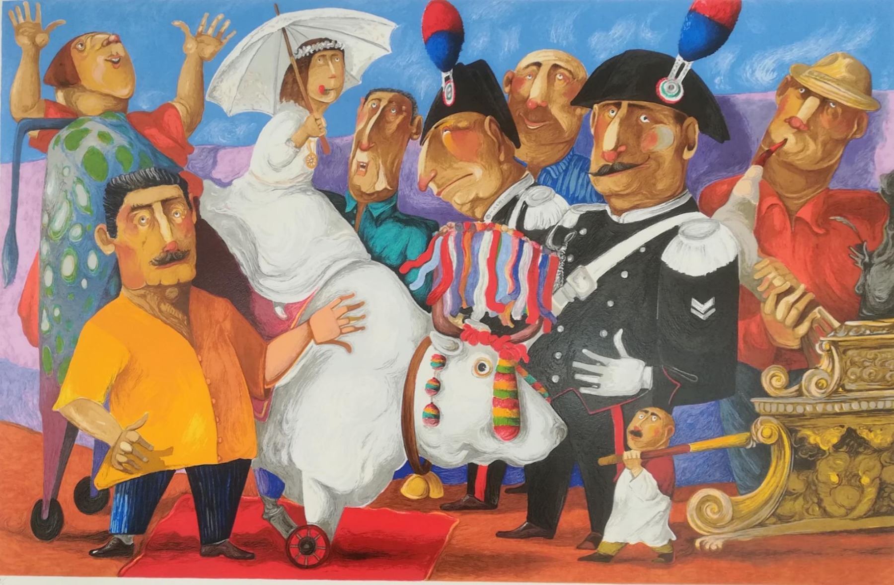 Artist: Pino Procopio. Medium: Original Serigraph. Title: SAN ZOPITO. Size: 70x100cm. Hand Signed and Numbered. Pino Procopio was born in 1954 in Guardavalle, Calabria. He enjoyed modelling clay since nursery school. In middle school he made erotic drawings, for which he was reproached many times. He attended the art school and then enrolled at the faculty of Architecture in Rome, never neglecting his artistic activity. In the 1970s, during his walks through Rome, he started to attend some of the galleries. His first exhibition opened in Rome at the La Bitta art centre in 1980. After that, he had a flourishing artistic career, rich in productions and exhibitions in the major Italian towns. Procopios artworks express irony, sarcasm and even cynicism. His artistic expression is provocative, without preconceptions, revelation of an intellectual delicacy. Now Procopio is recognised among the greatest Italian and international masters of the 20th century.: Pino Procopio was born in 1954 in Guardavalle, Calabria. He enjoyed modelling clay since nursery school. In middle school he made erotic drawings, for which he was reproached many times. He attended the art school and then enrolled at the faculty of Architecture in Rome, never neglecting his artistic activity. In the 1970s, during his walks through Rome, he started to attend some of the galleries. His first exhibition opened in Rome at the La Bitta art centre in 1980. After that, he had a flourishing artistic career, rich in productions and exhibitions in the major Italian towns. Procopios artworks express irony, sarcasm and even cynicism. His artistic expression is provocative, without preconceptions, revelation of an intellectual delicacy. Now Procopio is recognised among the greatest Italian and international masters of the 20th century..