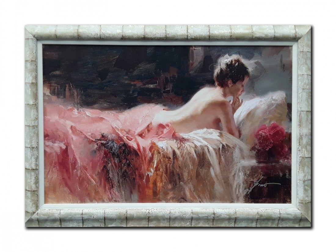 Pino's "Soft Light" limited edition canvas signed and numbered 210/295. This piece is of a dark haired woman lying on her bed, underneath a pink blanket. She is staring at her pillow, with pink flowers on her night table. This has been professionally matted with acid free matting and custom framed. Giuseppe "Pino" Dangelico (1939-2010) was born in Bari, It