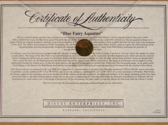 This is a limted-edition aquatint engraving based on two original animation drawings from Pinocchio, Walt Disney's classic animated feature film. As an added special touch, David Pacheco, Art Director for Walt Disney Classics, has signed each piece to commemorate his involvement with this edition.