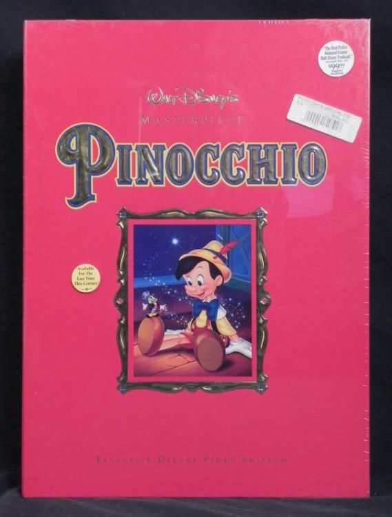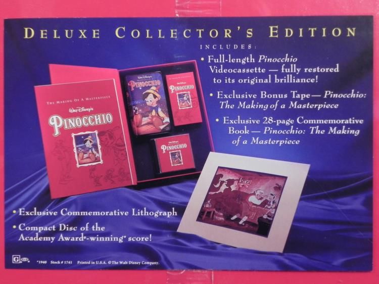 This is the Disney Masterpiece Pinocchio Exclusive Deluxe Video Edition. It includes the Pinocchio videocassette (fully restored) plus a bonus tape "Pinocchio: The Making of a Masterpiece," a 28-page Commemorative Book, a Commemorative Lithograph, and a Compact Disc of the Academy Award-winning score. All are in Mint condition, still sealed in the original packaging. Dare to dream, and keep believing with this magical set!