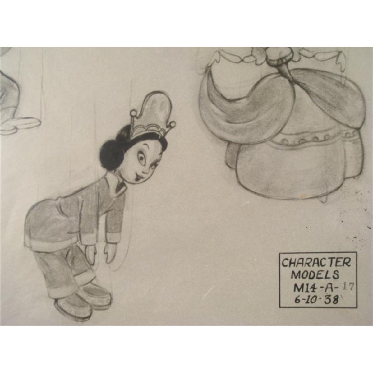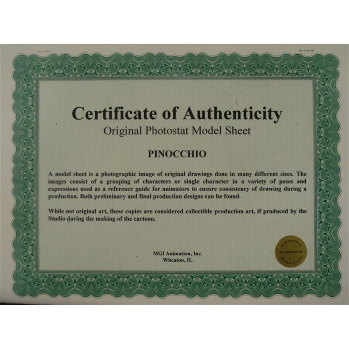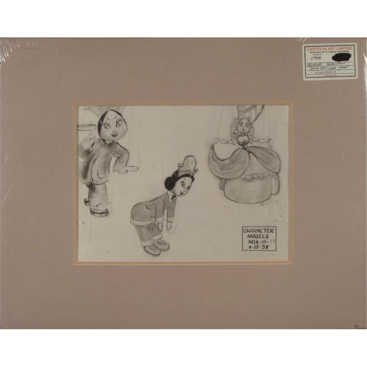 This is an original photostat copy used in the production of the classic Disney movie Pinocchio. This is from a model sheet drawing, which was a reference for the animators as they were drawing and painting the cels. This shows some of the character that were in Mister Geppetto's workshop. The lower left corner is identified with a number, and is dated 6-10-1938. This was probably early on in the production, as the film was released in 1940. * Medium: Photostat copy on paperTitle: "Character Models"Image size: 11 1/4 x 8 1/2 inches Presentation: Double matted in pinkMatte size: 16 x 20 inchesCondition: Excellent; sealed in cellophaneCertificate of Authenticity: Included