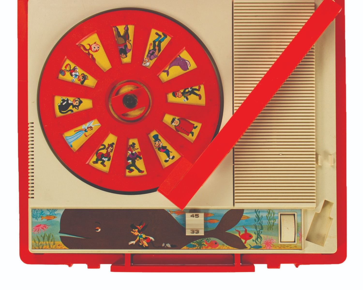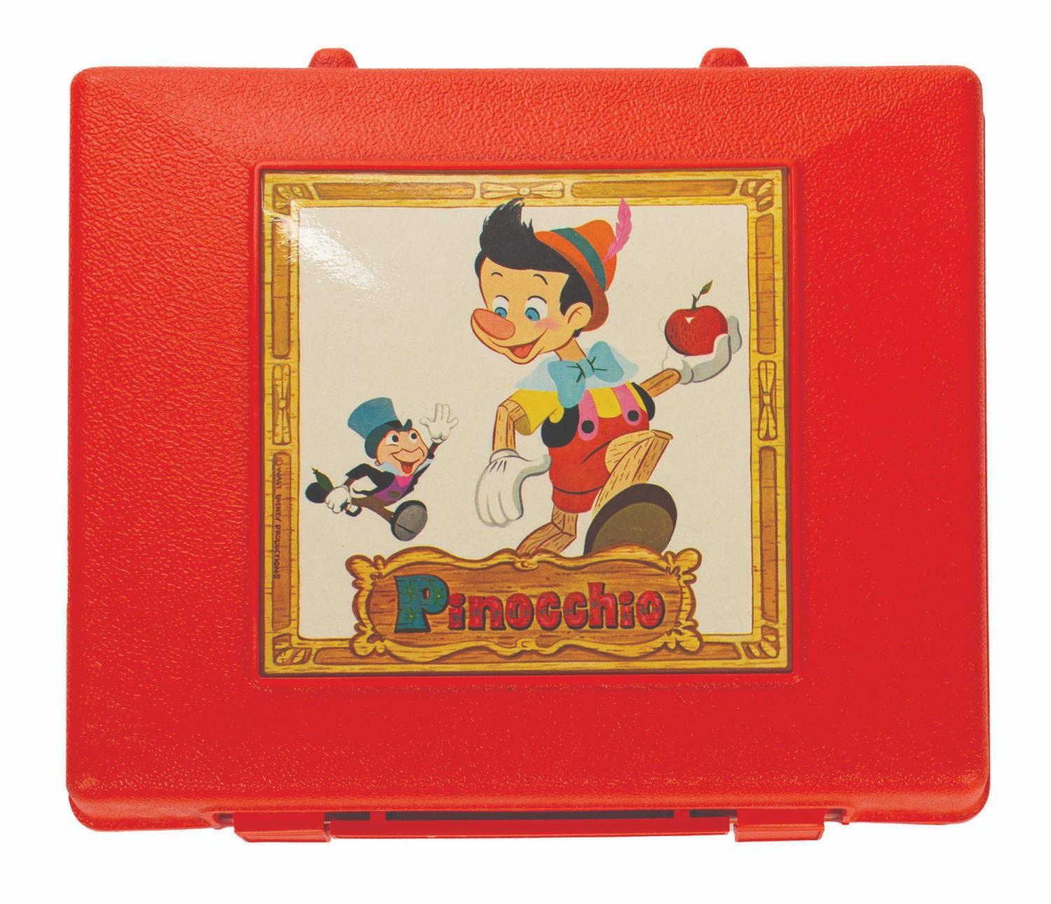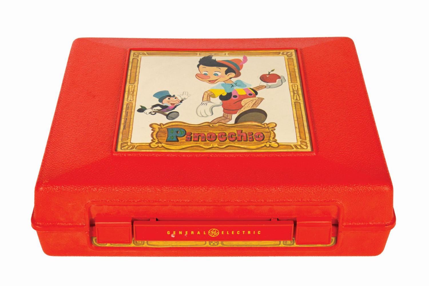 (Disney, c.1970s) A Pinocchio phonograph record player manufactured by General Electric. The device plays 33rpm and 45rpm records and features a manual tone arm, a textured rubber platter with cutout image windows, a pop-up 45 adapter, and built-in speaker. The turntable spins and the speaker produces sound but the arm is missing a needle. Measuring 11.5"x13.25" and 3.75" deep, the piece is in very good condition with some splitting to the plastic lid hinge, minor spot soiling, and staining to the plug.