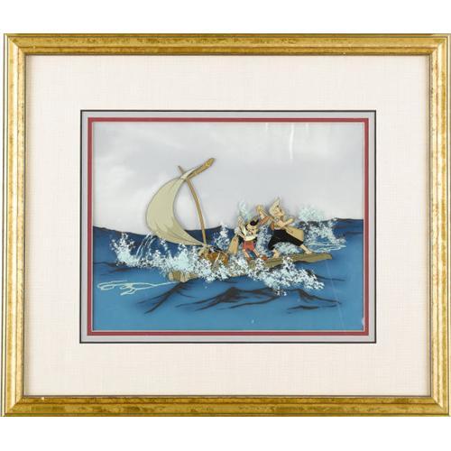 <B>Pinocchio, Geppetto, Figaro, and Cleo On A Raft "Pinocchio" Production Cel with Watercolor Production Background Original Art (Walt Disney, 1940).</B></I> Pinocchio and Geppetto make a desperate attempt to escape from Monstro, the whale, in this thrilling original production cel. Image area of 14.5" x 11". Framed, and in Excellent condition.