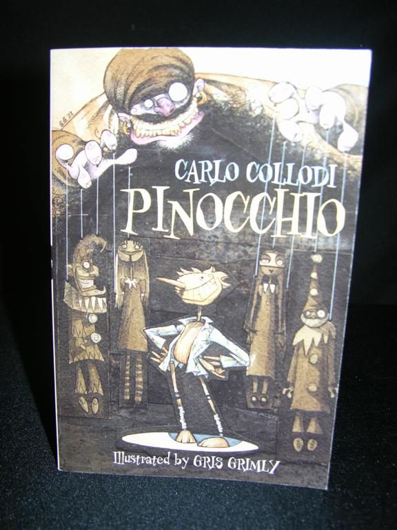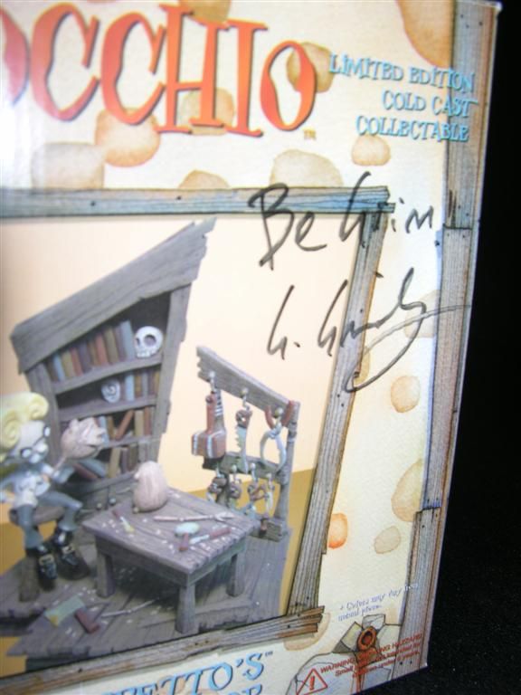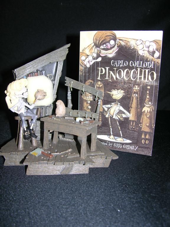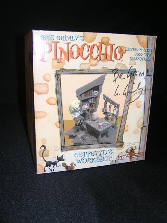 Boxed statue of Geppetto's Workshop as depicted in Pinocchio, designed by Gris Grimly and signed by the artist on the box. Also includes a Pinocchio book illustrated by Grimly, with an inscription and drawing on the title page. Oversized item. Additional postage required.