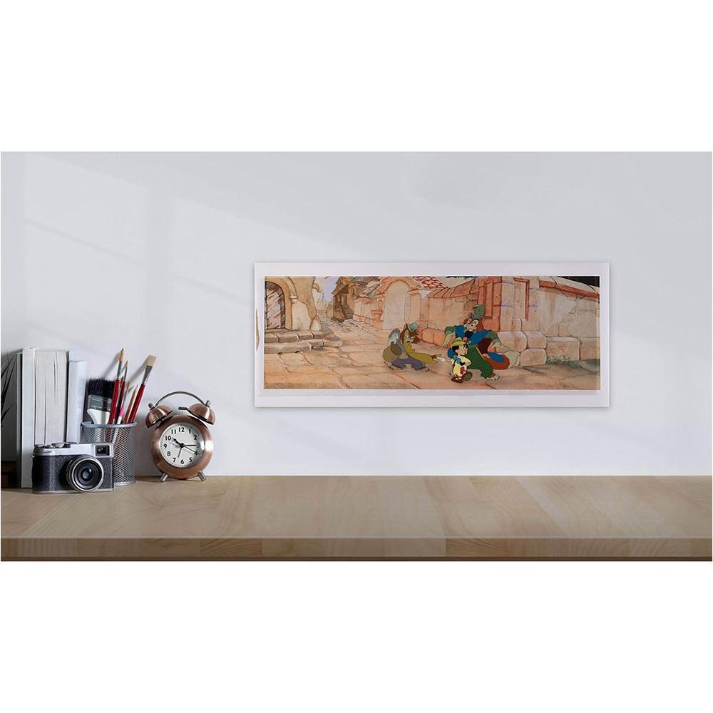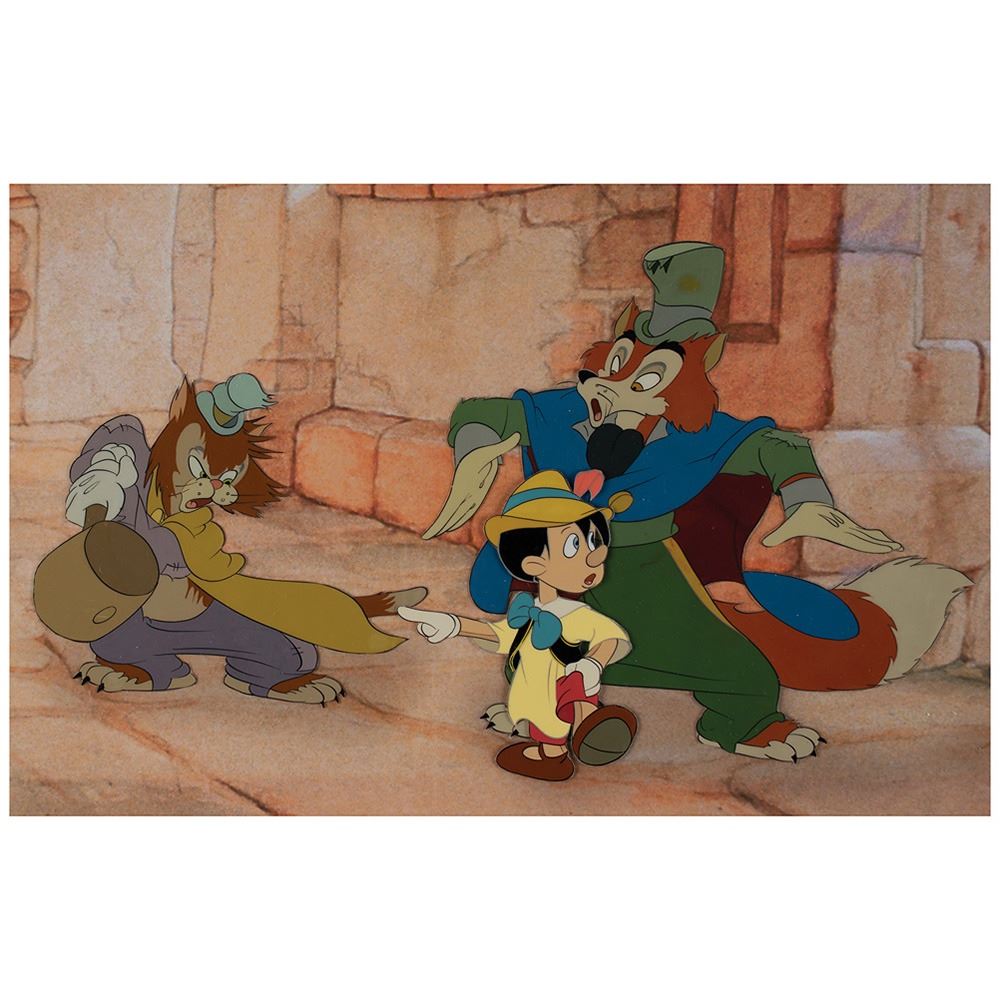 (Walt Disney Studios, 1940) Fantastic original production cels of Pinocchio, Honest John, and Gideon from Pinocchio, which depicts the devious fox and his dimwitted feline sidekick as they ambush Pinocchio on his way to school. Character images measure 3 x 4 (Pinocchio), 5.25 x 4.25 (Gideon), and 6 x 6.5 (Honest John), with overall dimensions of 31.75 x 12.75. The cels are placed on a panoramic Disney giclee background from the same film. In fine condition. An impressive set-up from the classic Disney film, which boasts three attractive full-length characters during a pivotal scene.