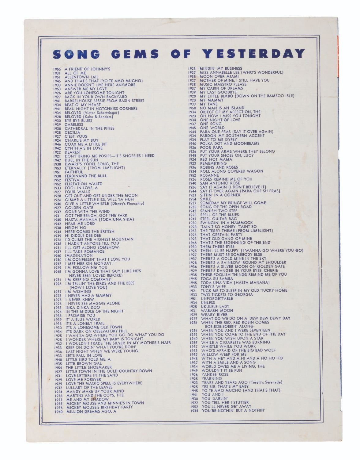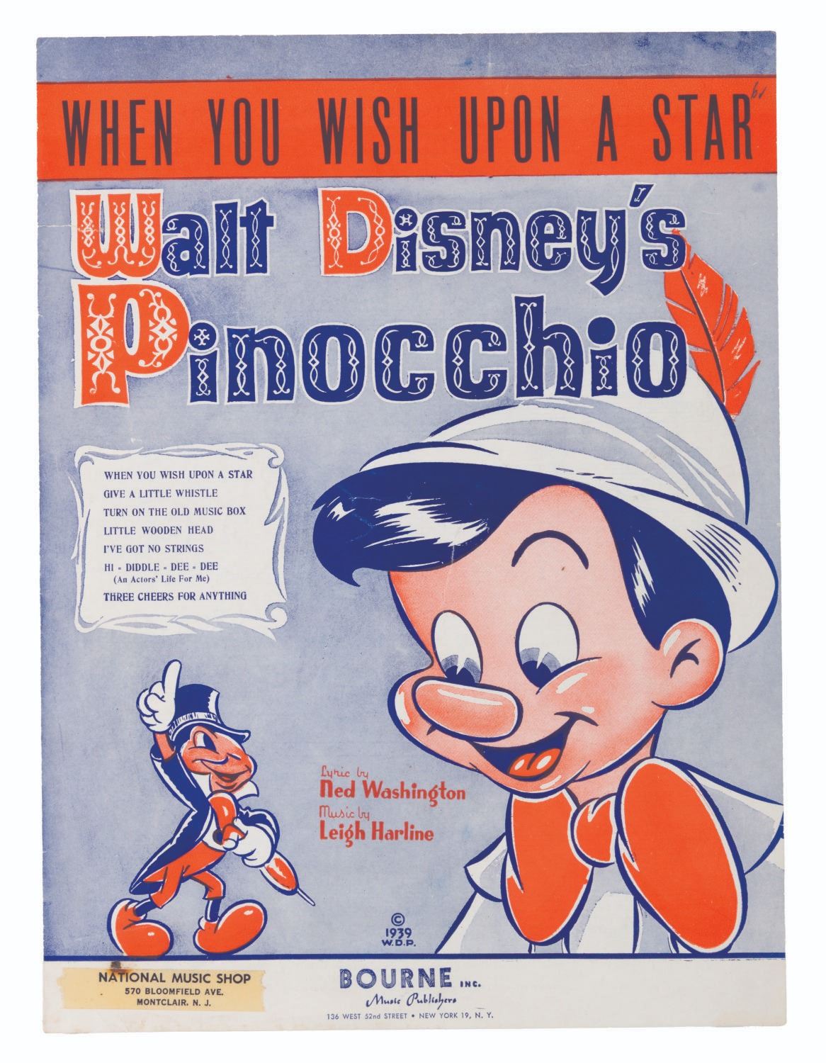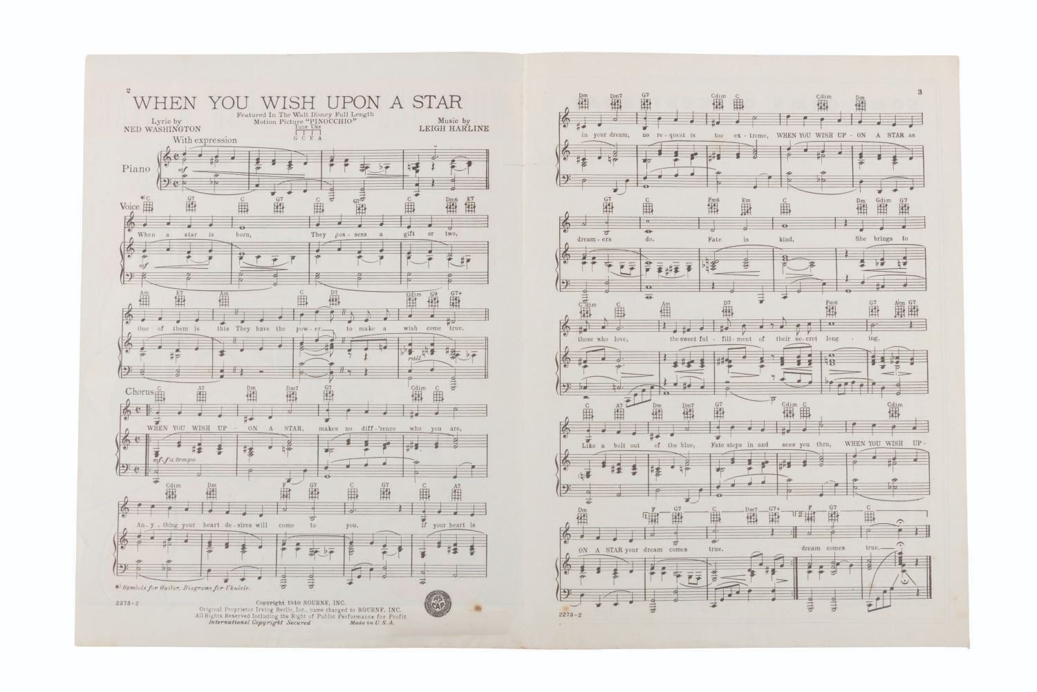 (Irving Berlin, 1940) Sheet music featuring "When You Wih Upon A Star" from Walt Disney's "Pinocchio." Measuring 9" x 12", the sheet music displays in very good condition with a 0.75" tear in the spine, and light spotting inside.
