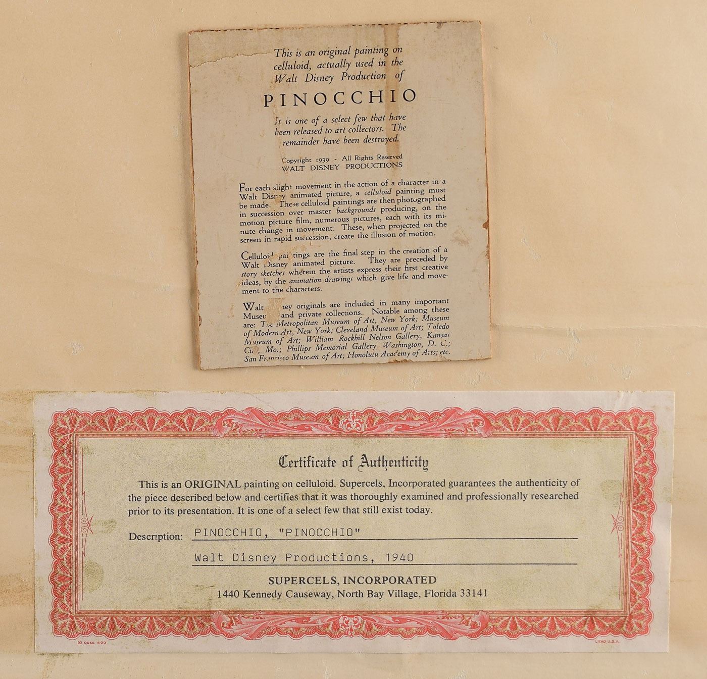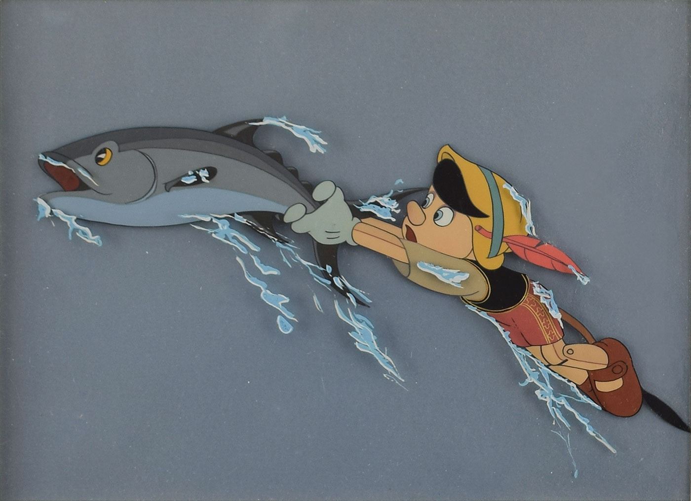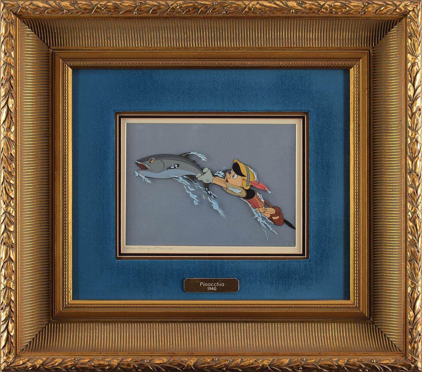 (Walt Disney Studios, 1940) Gorgeous original production cel featuring Pinocchio from Pinocchio, showing him in his puppet/donkey form as he is transported by a fish during the Pleasure Island scenes. The cel is placed on a solid blue-gray background. Image measures 8.75 x 4.5, with a mat opening of 9.25 x 6.5. Ornately framed to an overall size of 22.5 x 20. The piece has the original Disney Courvoisier Galleries label on the reverse. In fine to very fine condition. A beautiful, exemplary piece of animation production artwork from a classic Disney film.