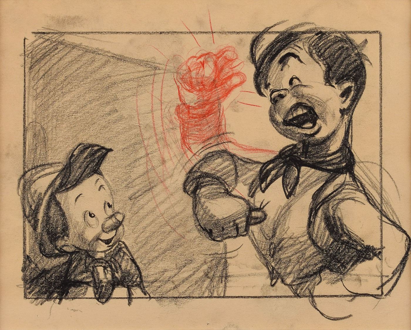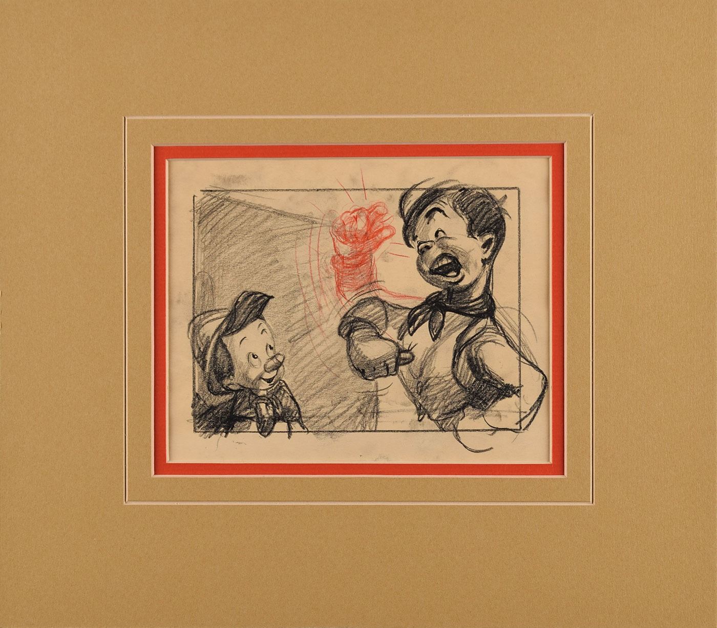 (Walt Disney Studios, 1940) Detailed original storyboard drawing featuring Pinocchio and Lampwick from Pinocchio, showing the boy puppet looking on as streetwise Lampwick sticks his thumb into his chest during the 'Pleasure Island' sequence; the motion of Lampwick's arm is indicated using colored pencil. Accomplished in graphite and colored pencil on animation paper. Image measures 6 x 4.25, with a mat opening of 7 x 5.5. Matted to an overall size of 12.75 x 11.25. In fine condition.
