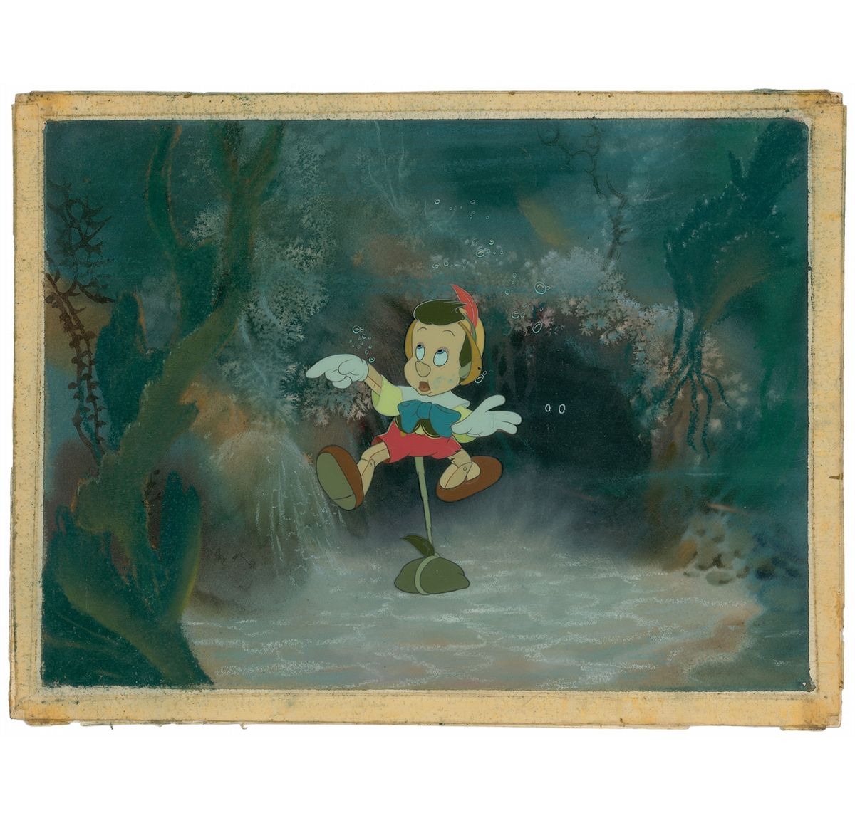 (Walt Disney Studios, 1940) Original production cel and production background featuring Pinocchio from Pinocchio, showing him underwater and tied to a rock anchoring him to the ocean floor, surrounded by bubble enhancements representing his breath. The cel is placed on a hand-painted preliminary background, which was created during production but not actually used in the film. Image measures 3 x 4.5, with overall dimensions of 12 x 9. In fine condition, with tape to edges. A gorgeous full cel featuring the main character paired with a well-done background to make an impressive and unique display.