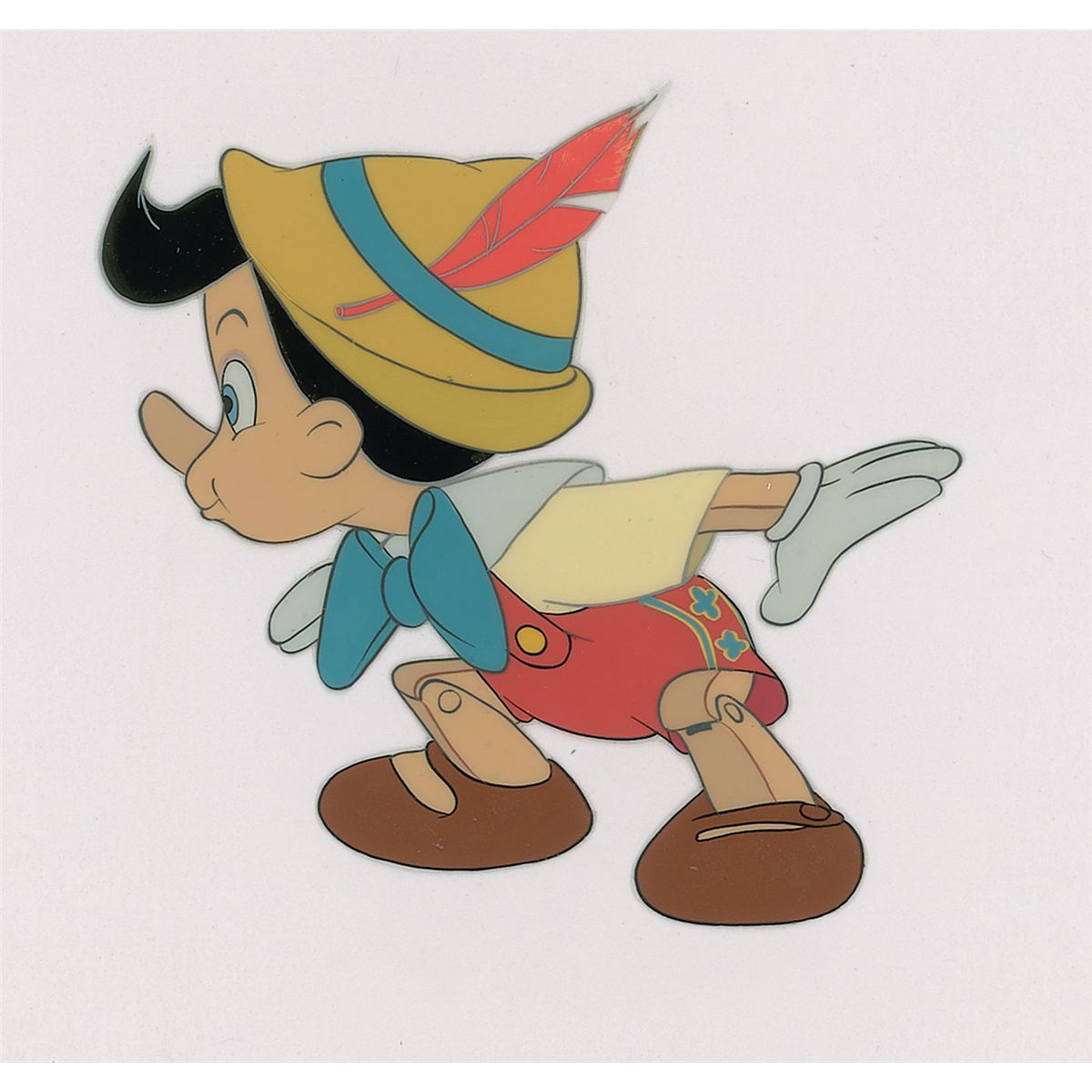 (Walt Disney Studios, 1940) Original production cel featuring Pinocchio from Pinocchio, showing him in full figure as a puppet. The cel is trimmed to image and mounted on a new cel. Image measures 3.5 x 3.5. Fully paint restored to fine condition.