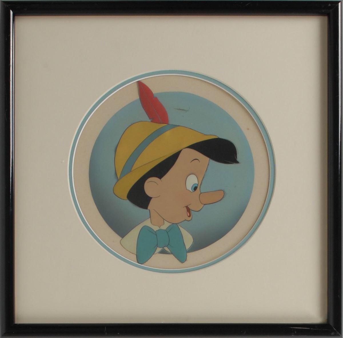 (Walt Disney Studios, 1940) Superb original production cel featuring Pinocchio from Pinocchio, showing him in profile after his nose has grown a little bit. The cel has been trimmed and applied to an airbrushed background as prepared by Courvoisier Galleries for sale. Image measures 6 x 8, with a mat opening of 8.75 x 8.75. This piece is also framed to an overall size of 15 x 15. In fine condition. An ideal example of this classic character.
