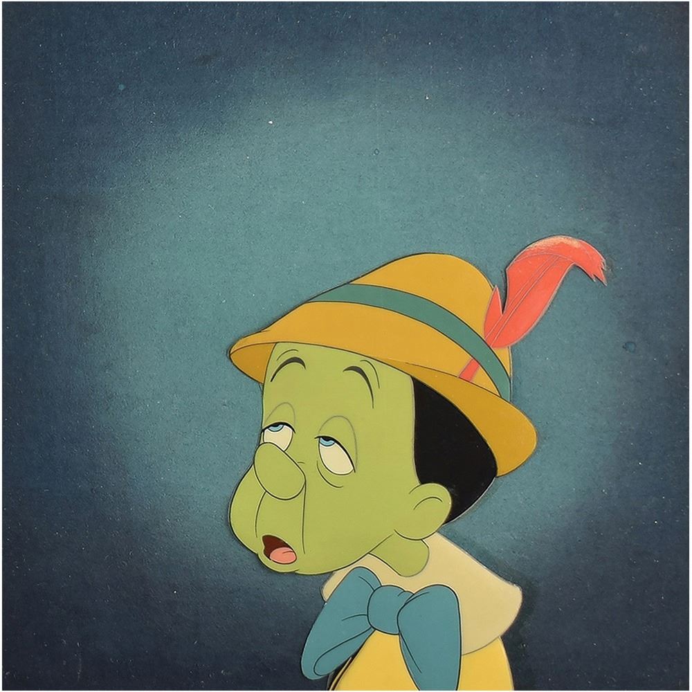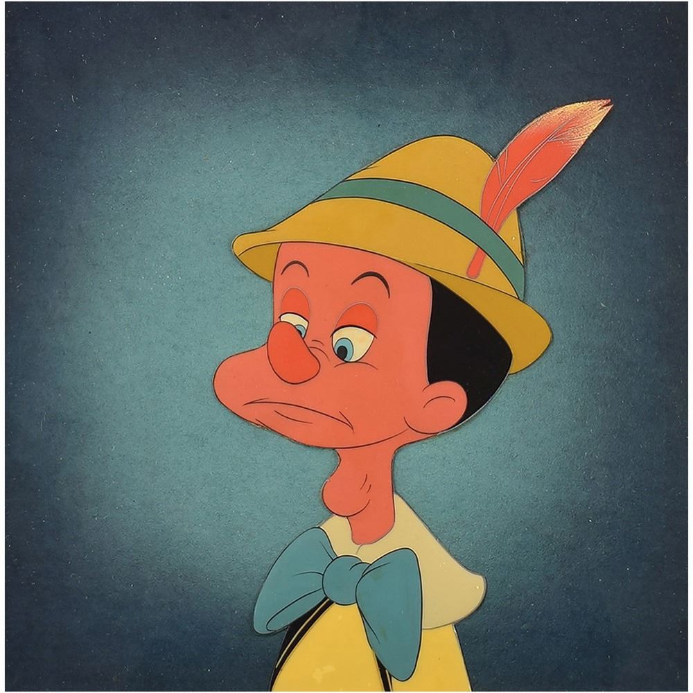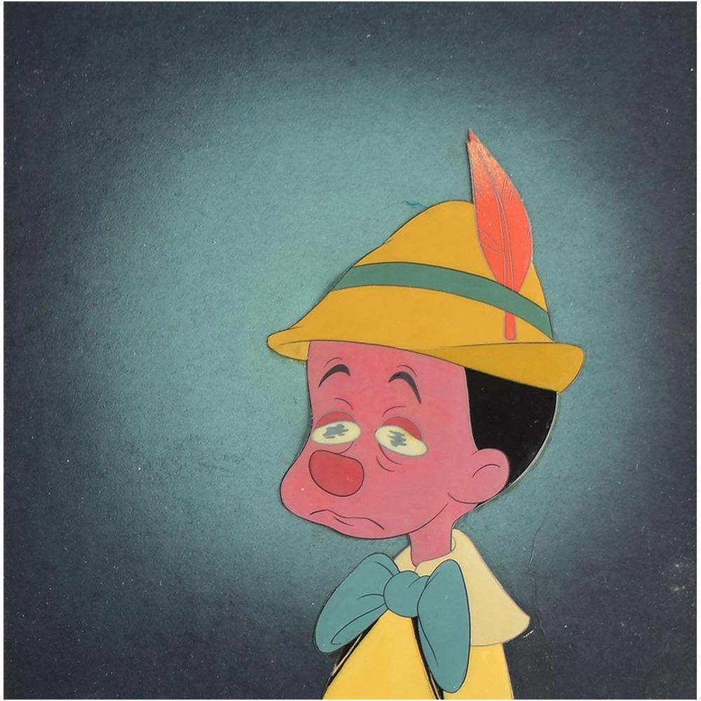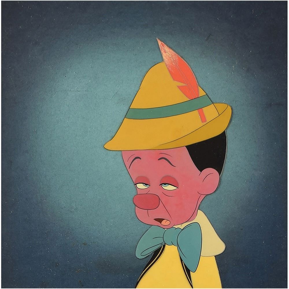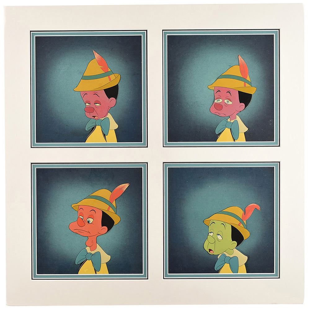 (Walt Disney Studios, 1940) Extremely rare display of four original production cels of Pinocchio from the classic animated film of the same name, depicting the boy puppet as he reels from the effects of his first cigar, showing in brilliant sequence Pinocchio gulping the smoke, his eyes watering over, and his complexion changing in color from purple to a sickly green. Each cel is placed on an airbrushed background. The cel images range in size from 3.25 x 6.5 to 4.25 x 6.25, with each mat opening measuring 7.5 x 7.5. Attractively triple-matted to an overall size of 21 x 21. In overall fine condition.