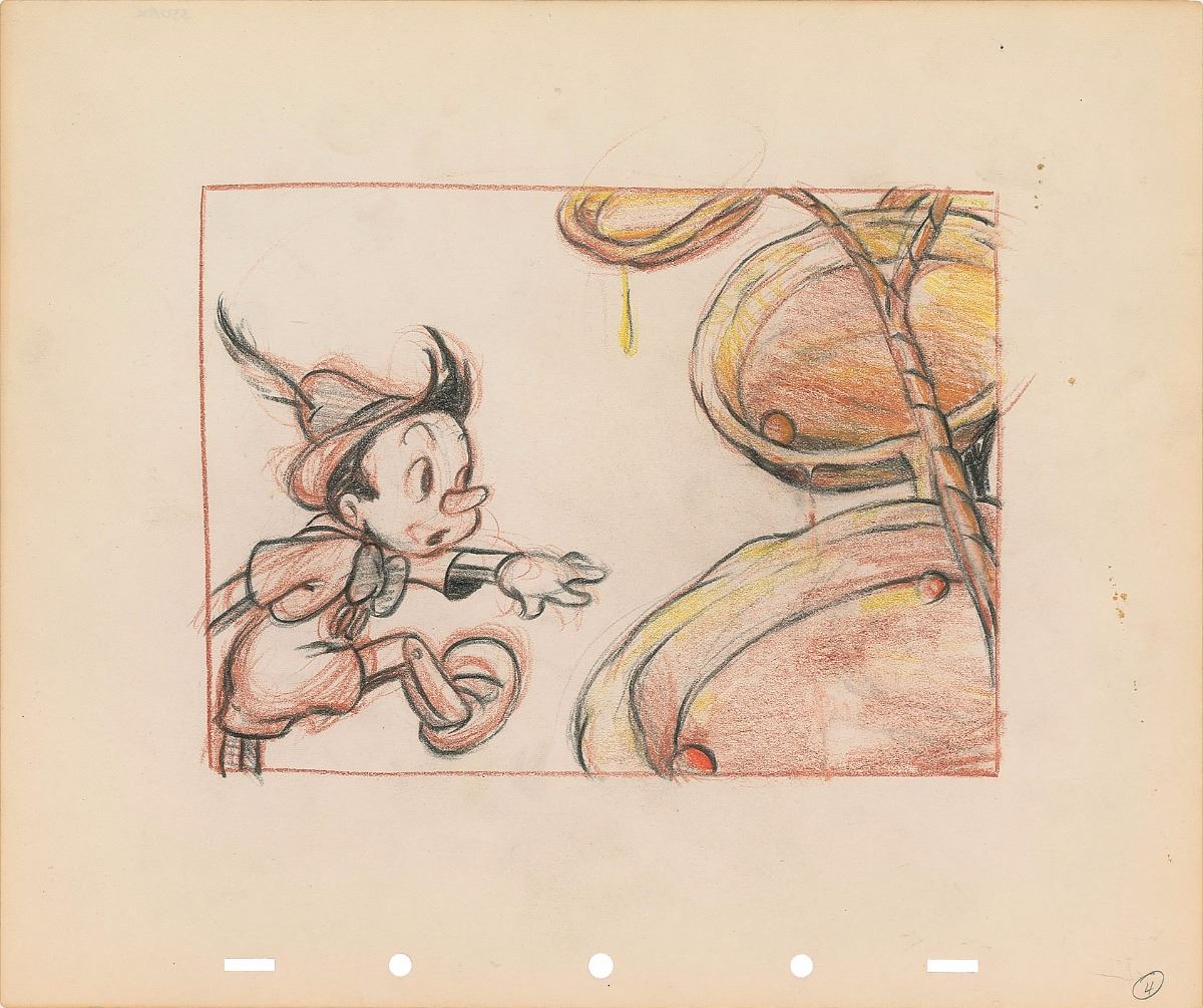 (Walt Disney Studios, 1940) Original production concept storyboard from Pinocchio, showing the food-tempted boy puppet during the Pleasure Island sequence. Accomplished in graphite and colored pencil on untrimmed 12 x 10 animation paper. Image measures 8 x 5.75. In fine condition.