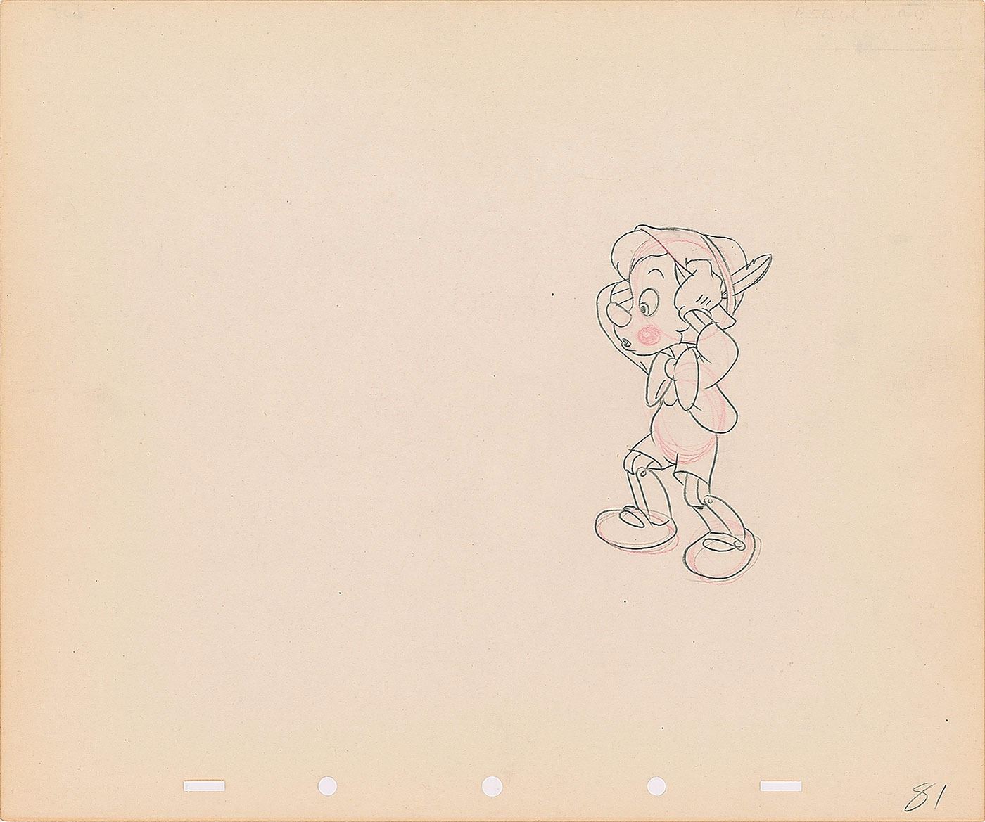 (Walt Disney Studios, 1940) Original production drawing featuring Pinocchio from Pinocchio, showing him in his marionette form. Accomplished in graphite and colored pencil on untrimmed 12 x 10 animation paper. Image measures 2 x 4.25. In fine condition.