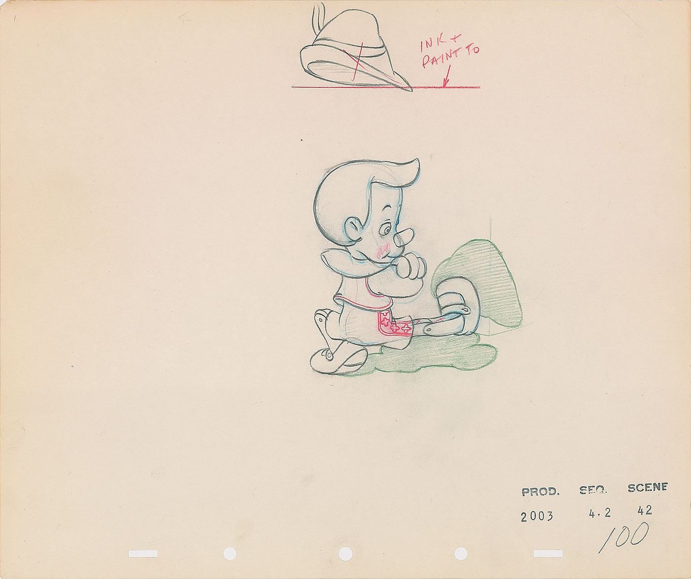 (Walt Disney Studios, 1940) Original production drawing featuring Pinocchio from Pinocchio, showing the boy puppet crouched down with his cap in the air. Accomplished in graphite and colored pencil on untrimmed 12 x 10 animation paper, stamped in the lower right: "Prod. 2003, Seq. 4.2, Scene 42." Total image measures 3.75 x 6.5. In fine condition.