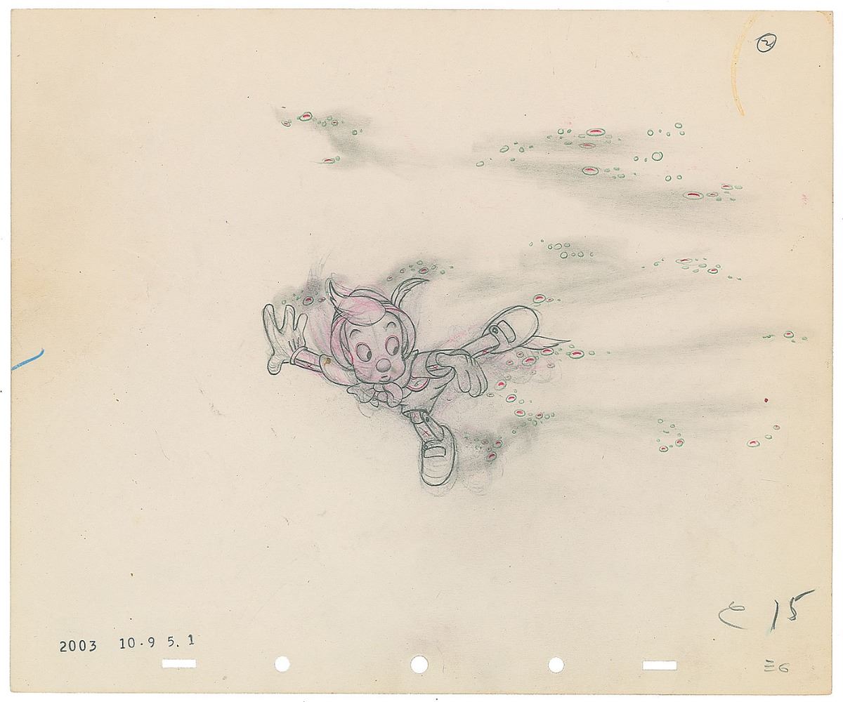 (Walt Disney Studios, 1940) Fantastic original storyboard drawing featuring Pinocchio from the eponymously titled film, showing the wide-eyed boy puppet swimming underwater with bubbles all about. Accomplished in graphite and colored pencil on untrimmed 12 x 10 animation paper. Total image measures 8 x 5.5. In fine condition.