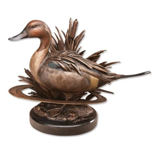 Wonderfully detailed and handsomely finished representation of a pintail drake Composed using Big Sky Carvers' proprietary "Montana Bronze" process, which blends pewter and bronze with fine resins, finished with metallic paint and hand-applied patinas for a distinguished and aged look. Pintail sculpture measures 14?"W x 10?"H