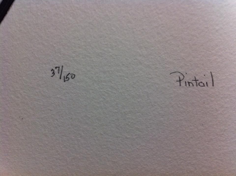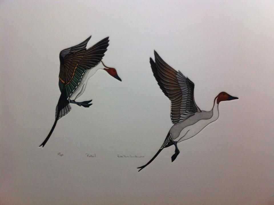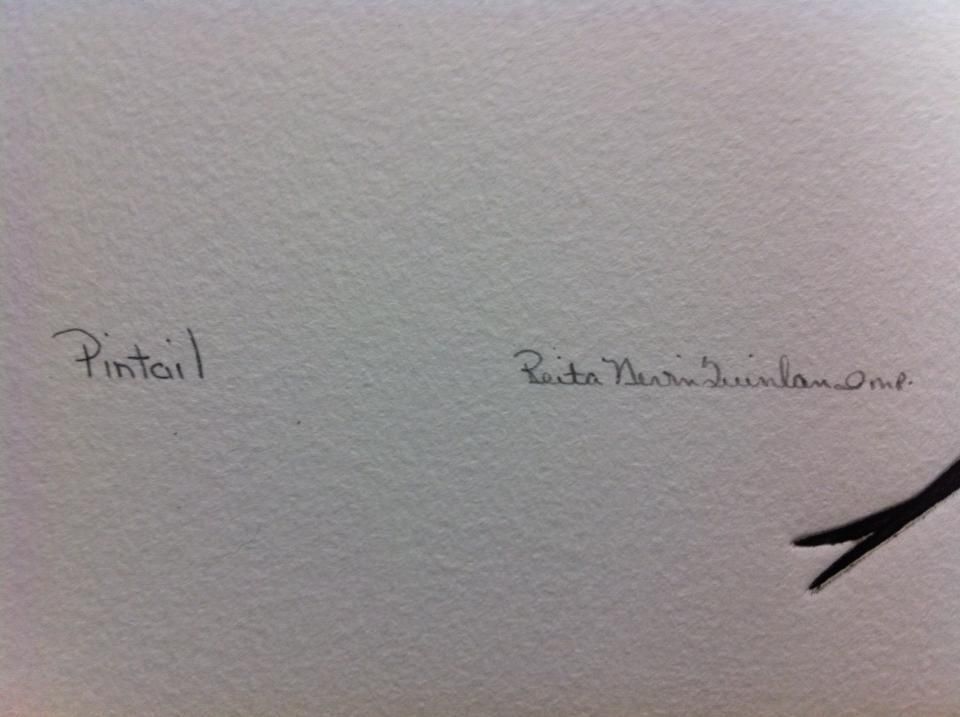 "Pintail" Colored etching canvasbacks. Numbered 37/150 Size is 15" x 22" Signed by Reita Nevin Quinlan Reita was the first of the Nevin siblings to apprentice with the Nevin Workshop, an intaglio printmaker's studio started by her father Arthur Nevin. There, at its inception, she helped create many of the innovative and creative intaglio printmaking techniques now used by the artists who attended. Learning colorist and printmaking techniques, Reita developed the skill necessary to qualify her as a professional fine art printer. Upon completion of her term as an apprentice she became a registered intaglio colorist and printmaker and for several years gave instruction to a group of area artists. Becoming a full partner in the Nevin Workshop, Reita began collaborating with her father on a number of wildfowl backgrounds for the American Decoy Series published by The Nevin Workshop. Since then she has worked on many diverse images, focusing on her interests in wildlife. Using her extensive knowledge of the etching process, Reita's work is extremely technical as well as sculptural.