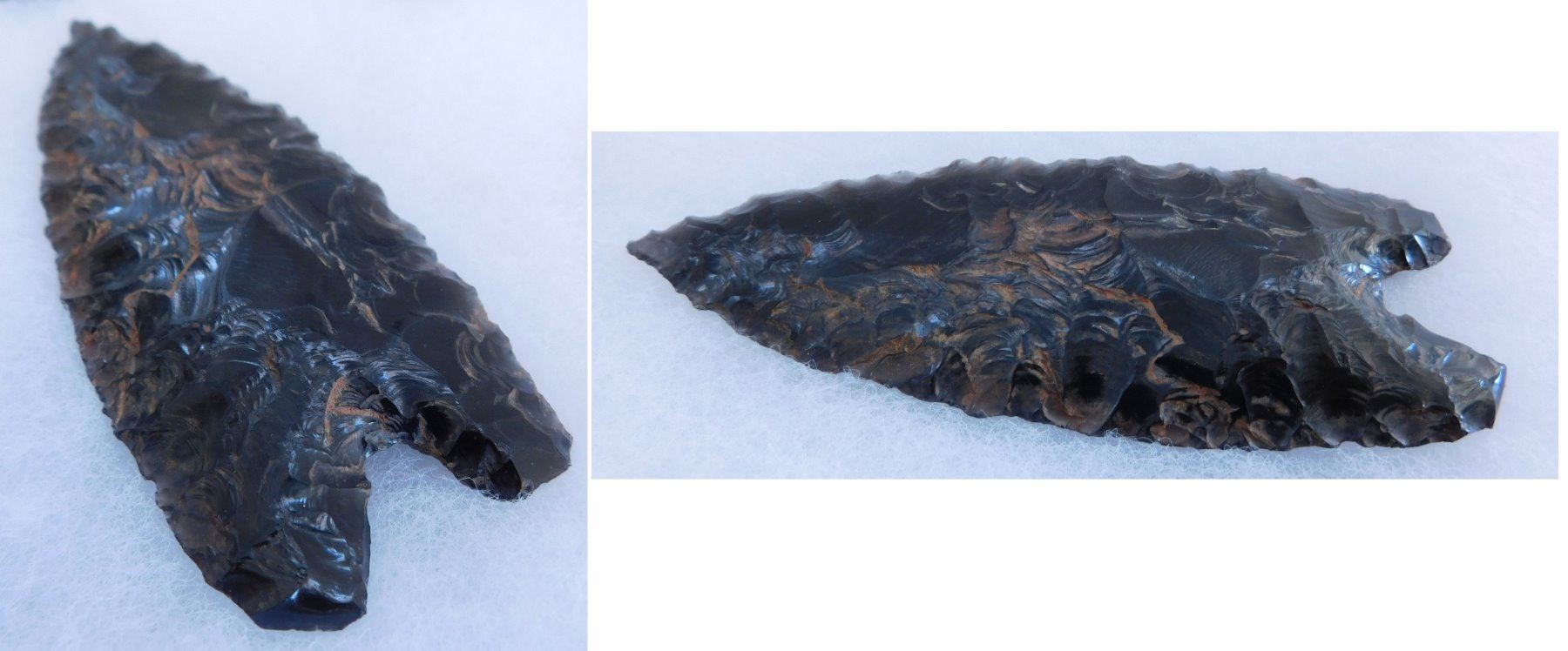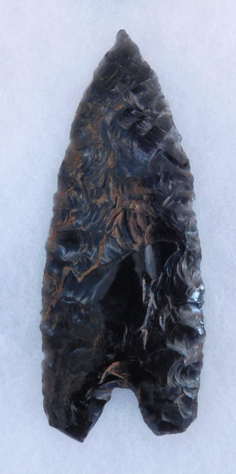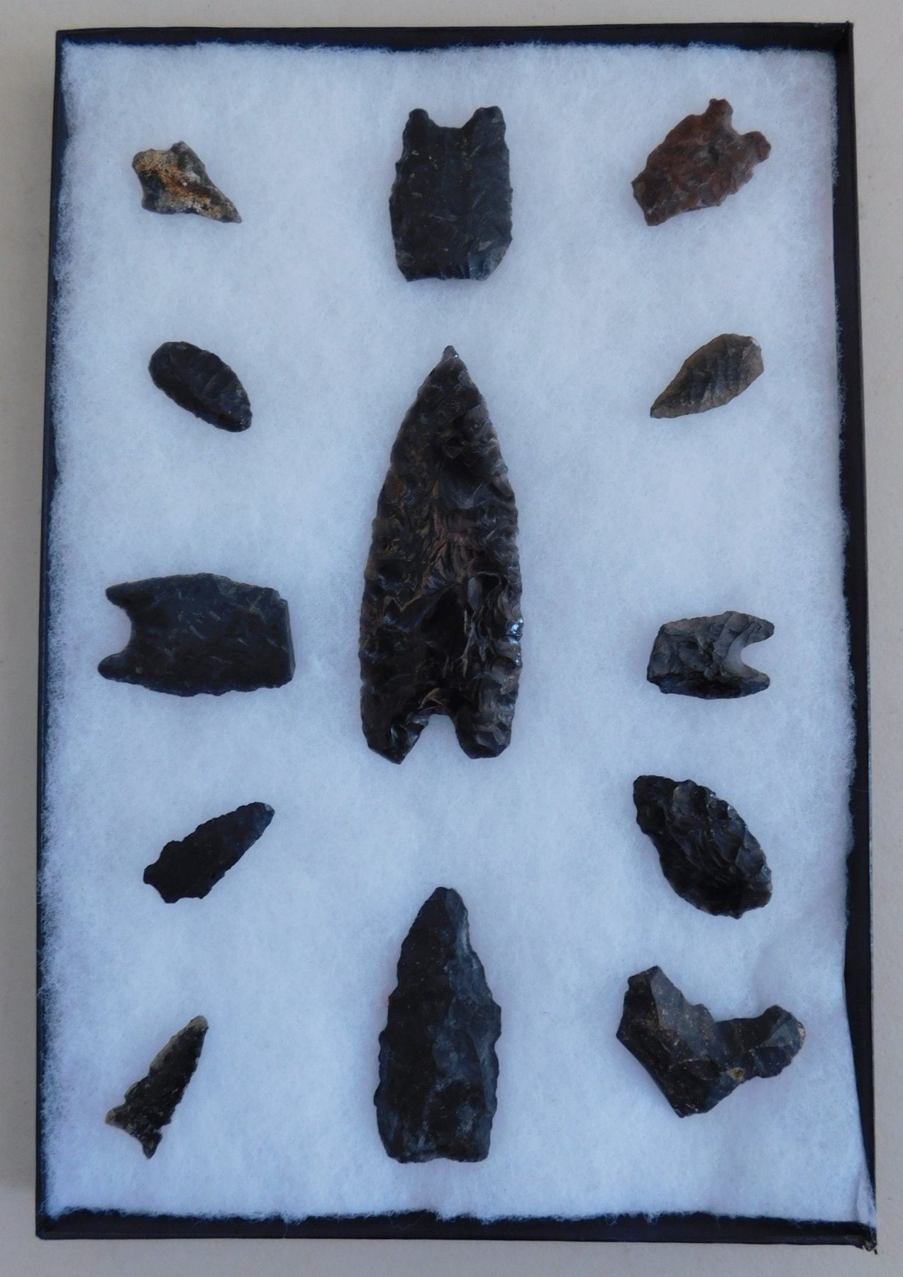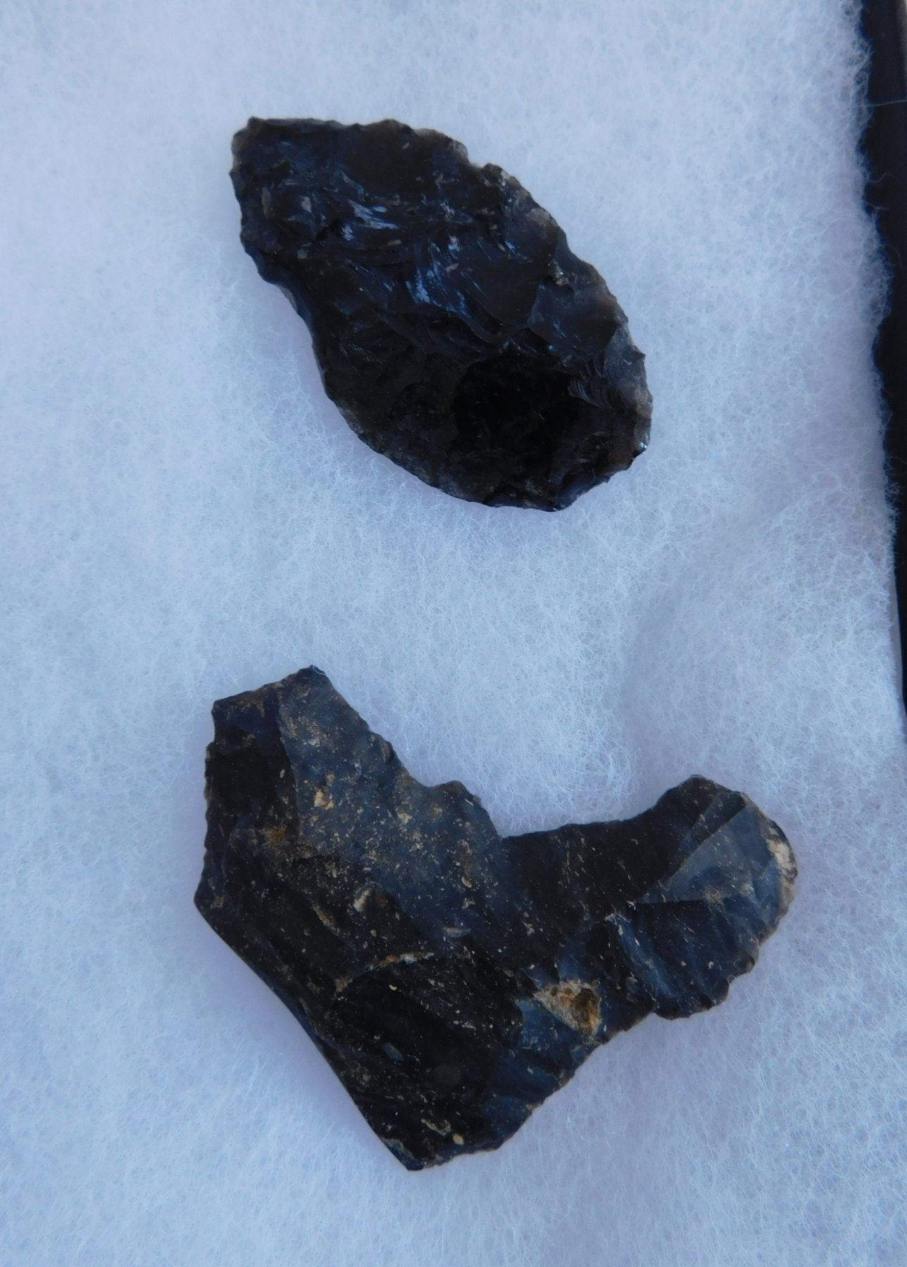 Pinto Basin Paleo Collection, circa 9000 years old. Made of obsidian, the items measure from 1.25" to 4" long. Fresno County, California. Also, nice clovis base. Condition: As found, see images. Shipping: $22.50 w/insurance and signature.