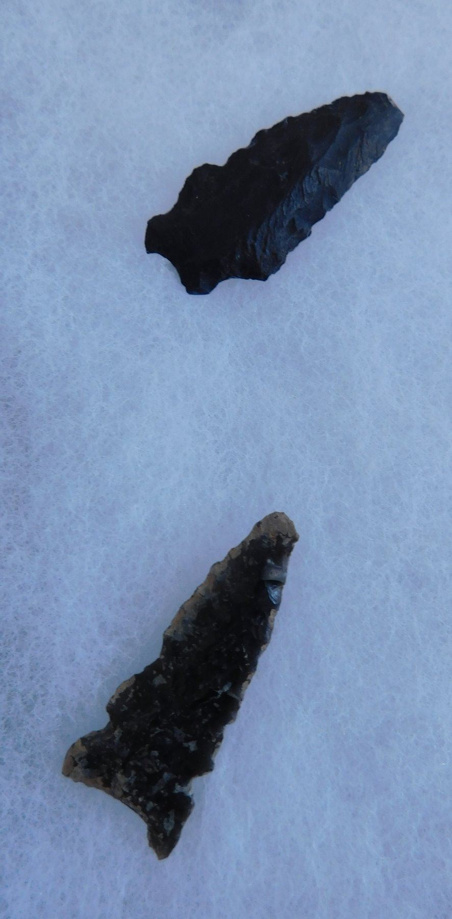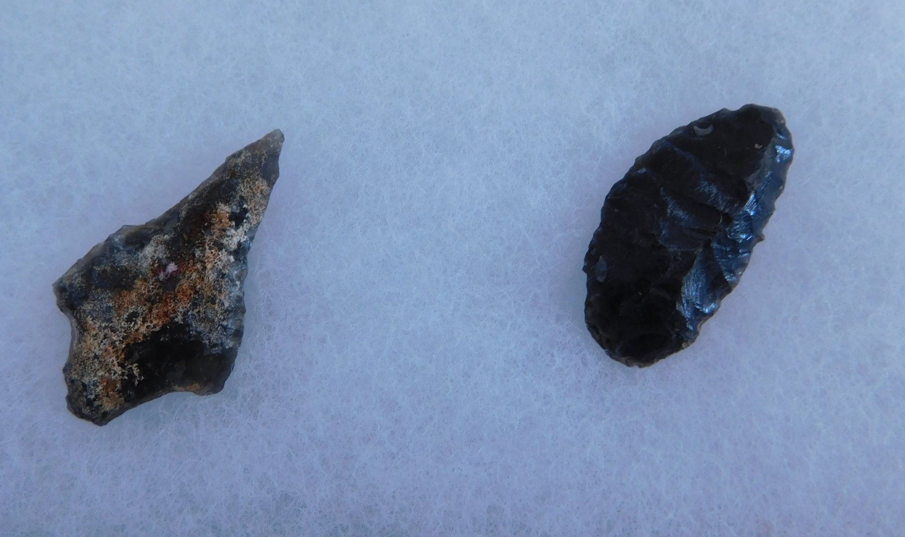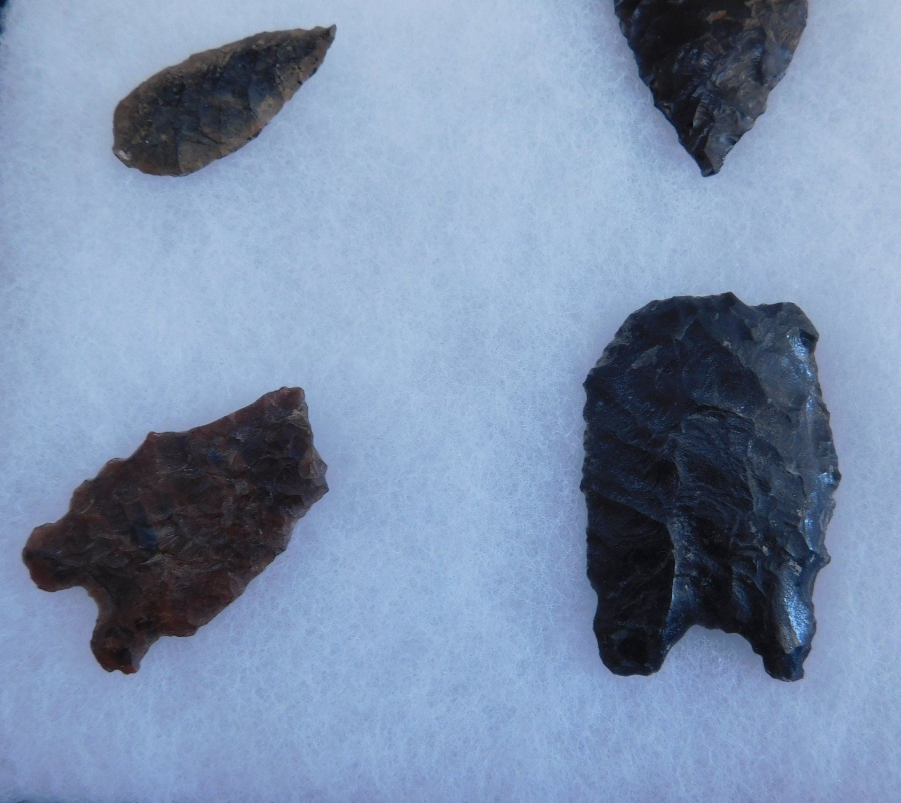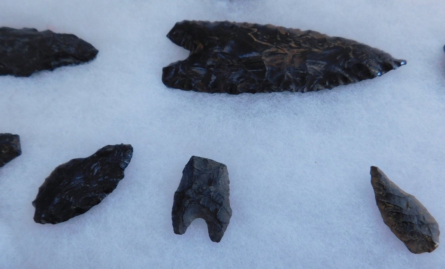 Pinto Basin Paleo Collection, circa 9000 years old. Made of obsidian, the items measure from 1.25" to 4" long. Fresno County, California. Also, nice clovis base. Condition: As found, see images. Shipping: $22.50 w/insurance and signature.