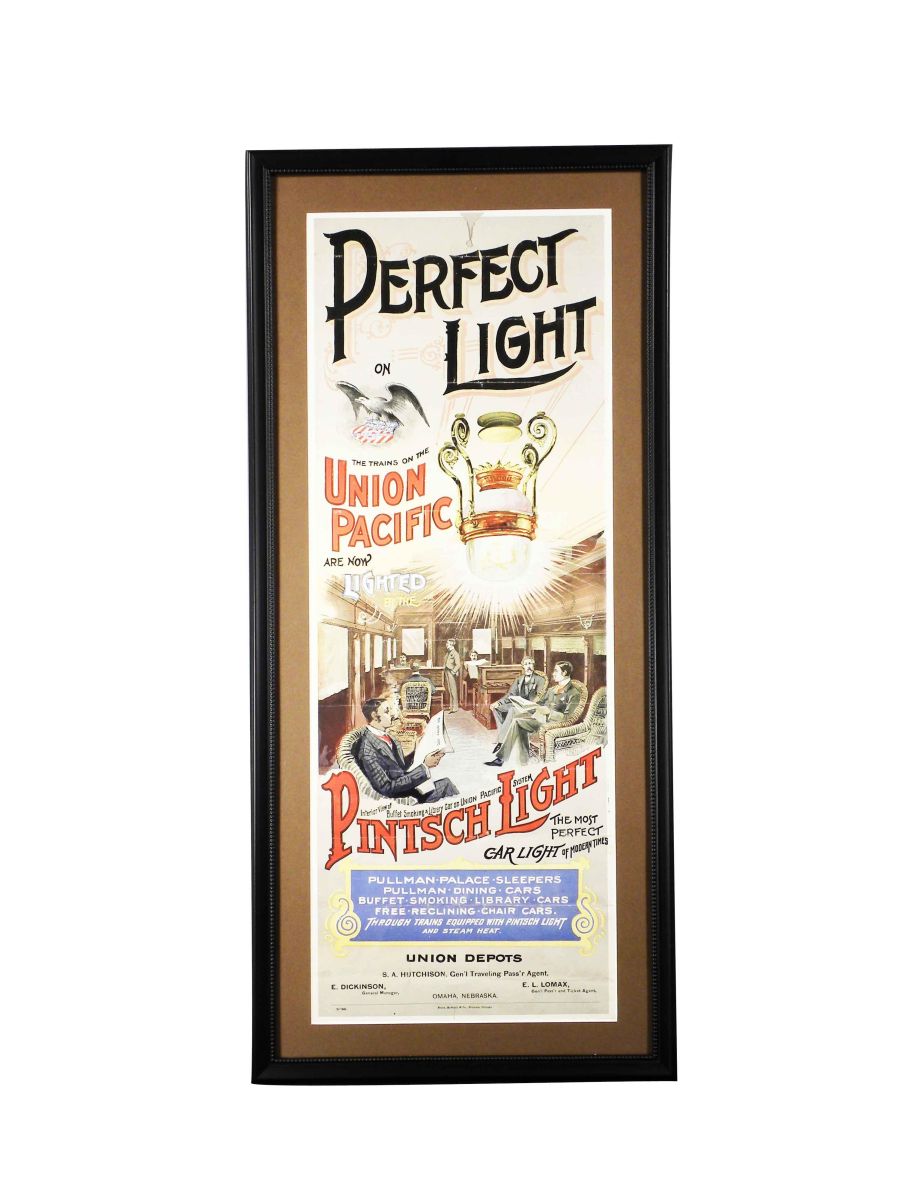 Pintsch Light Paper Sign. The most perfect car light of modern times. Great graphics and color. Some folds and paper loss at 12:00 otherwise good condition. 10 1/2 X 28 inches image only.