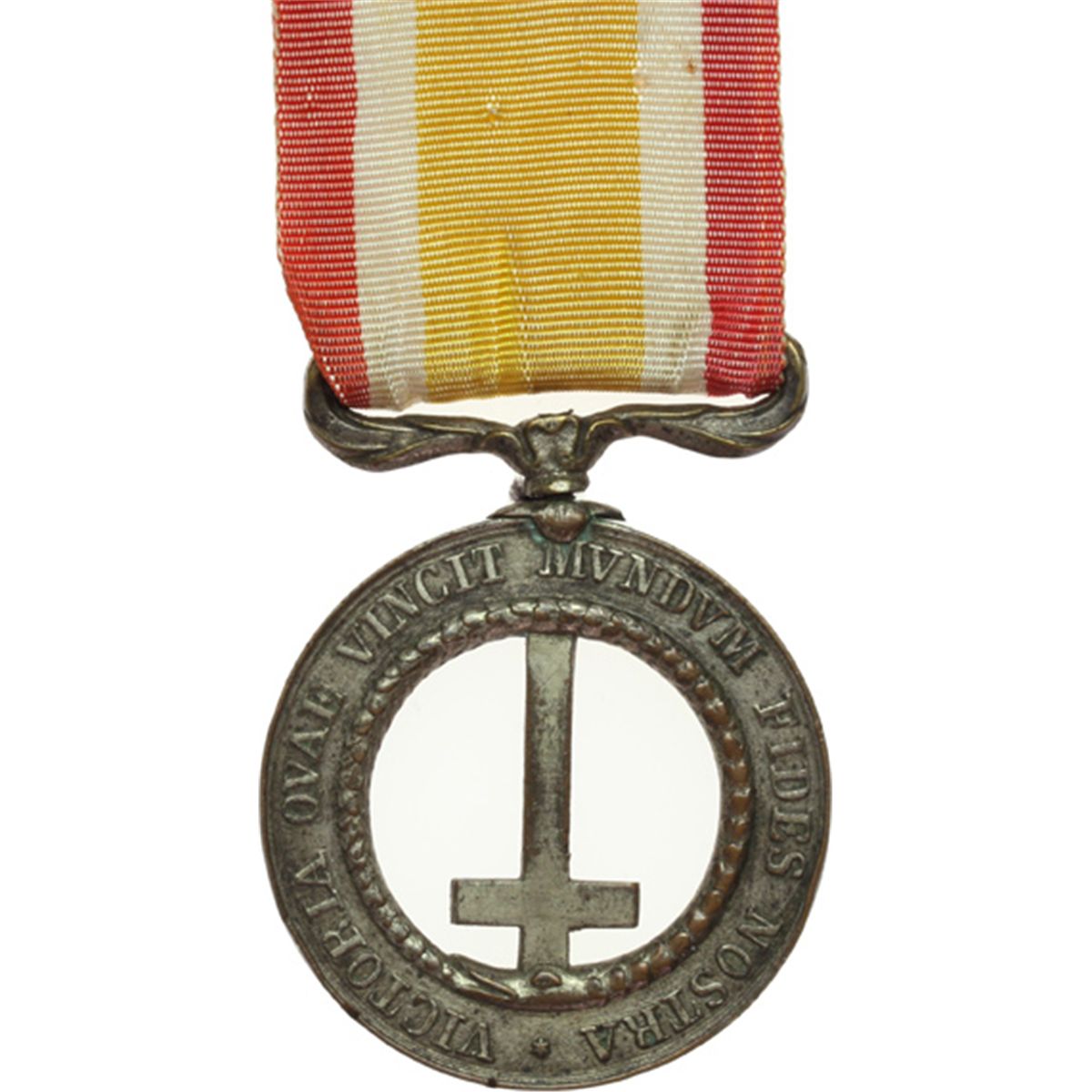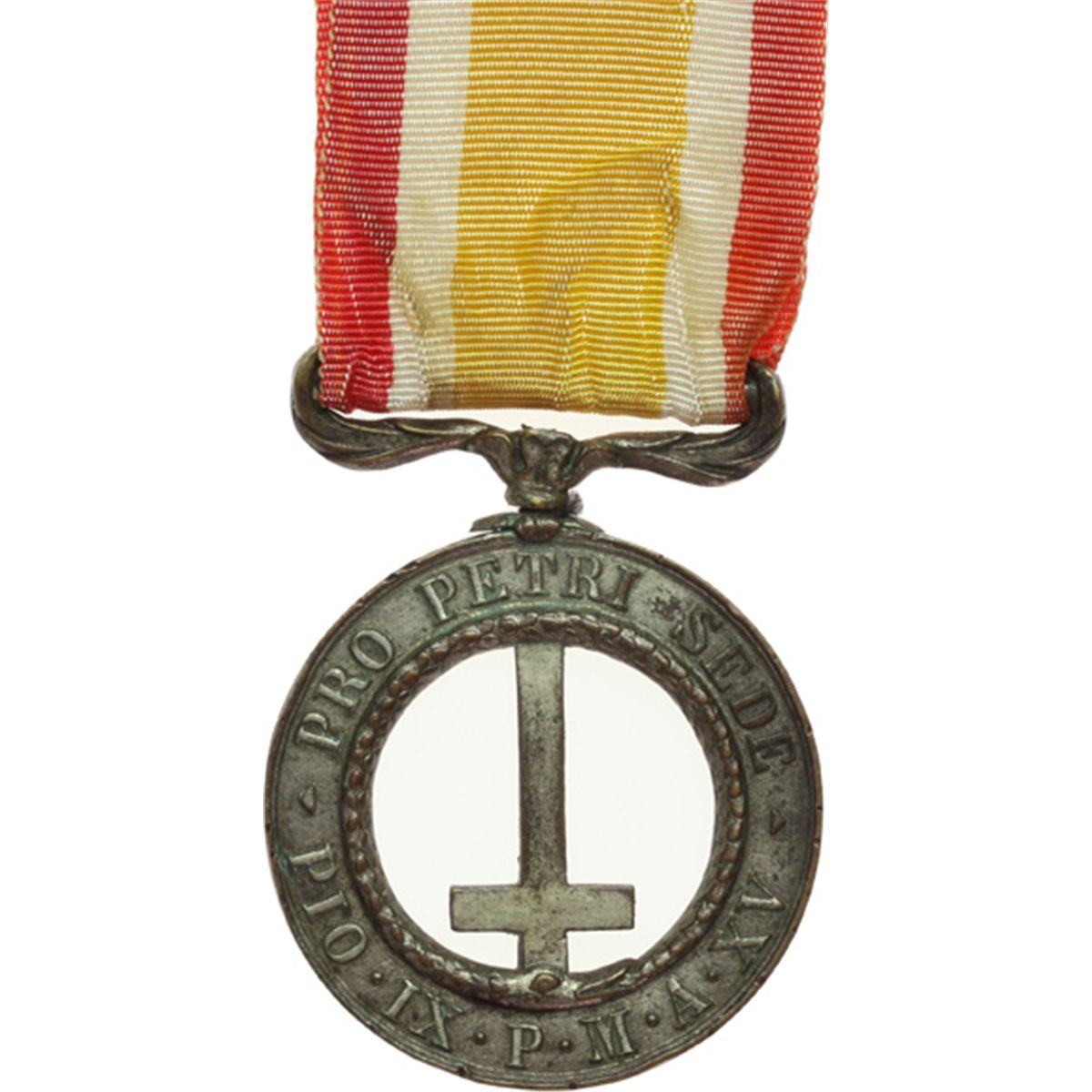Medaglie Papali. Pio IX (1846-1878), Giovanni Mastai Ferretti. Medaglia detta di 'Castelfidardo'. Bart. XV-12. MB. mm. 39.00 RR. Nastrino non originale. BB+. Decorazione istituita il 12 novembre 1860 per chi aveva preso parte alla campagna del 1860. Chi ne era insignito aveva riconosciuto un anno di servizio in pivp ed era dichiarato benemerito della Chiesa Cattolica, della Sede Apostolica e di tutte le Societv† Umane. La stranezza della croce posta rovesciata vuol ricordare il martirio del primo Pastore e la serpe che si morde la coda simboleggia l'eternitv†.