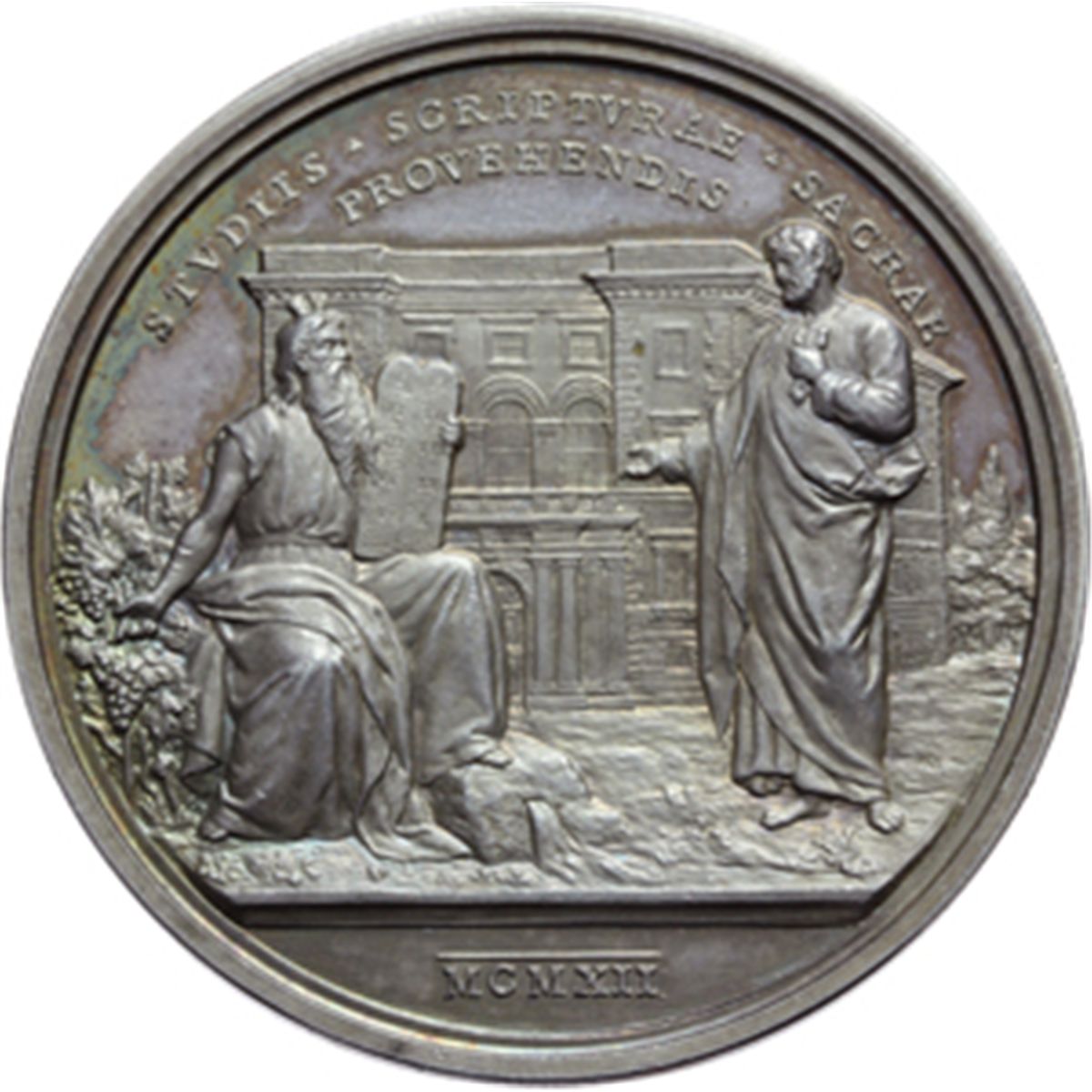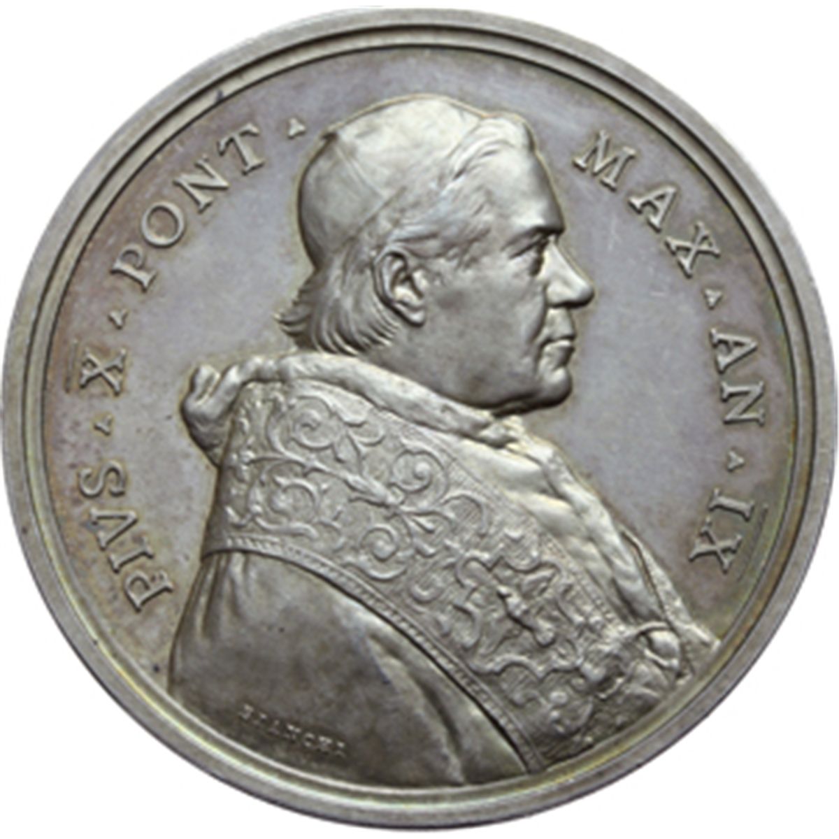 Medaglie Papali. Pio X (1903-1914), Giuseppe Melchiorre Sarto. Medaglia annuale, A. IX. D/ Busto a destra con berrettino, mozzetta e stola. R/ S. Pietro indica la nuova sede degli studi biblici. Bart.E. 912. AG. mm. 43.50 Inc. Francesco Bianchi. qFDC/FDC. Fondazione Istituto Biblico.