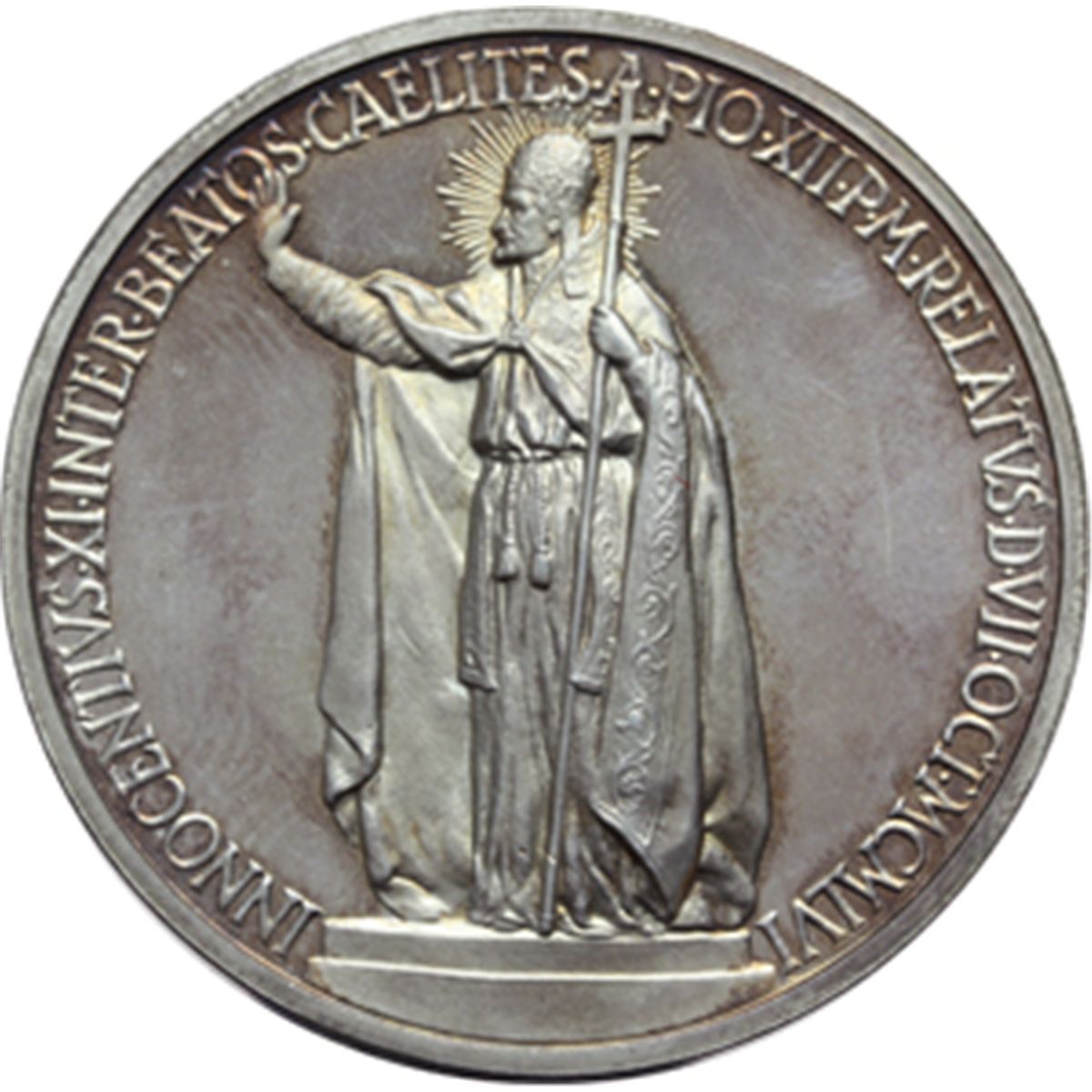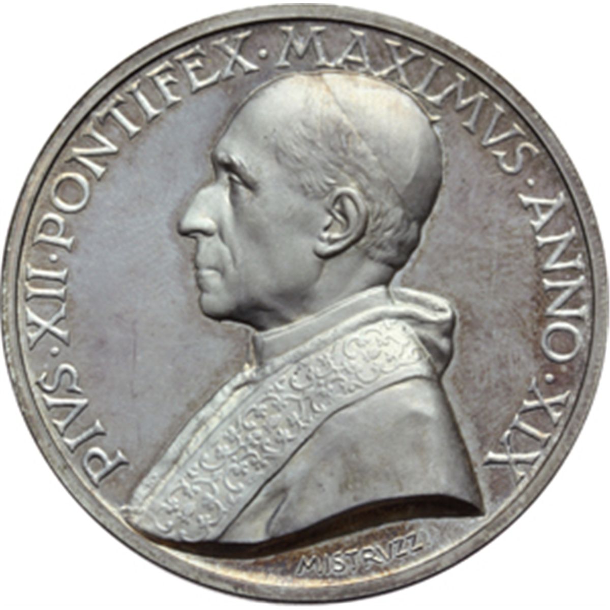 Medaglie Papali. Pio XII (1938-1959), Eugenio Pacelli. Medaglia annuale, A. XIX. D/ Busto a sinistra con berrettino, mozzetta e stola. R/ Il Pontefice Innocenzo XI. Bart.E. 957. AG. mm. 44.00 Inc. Aurelio Mistruzzi. FDC.