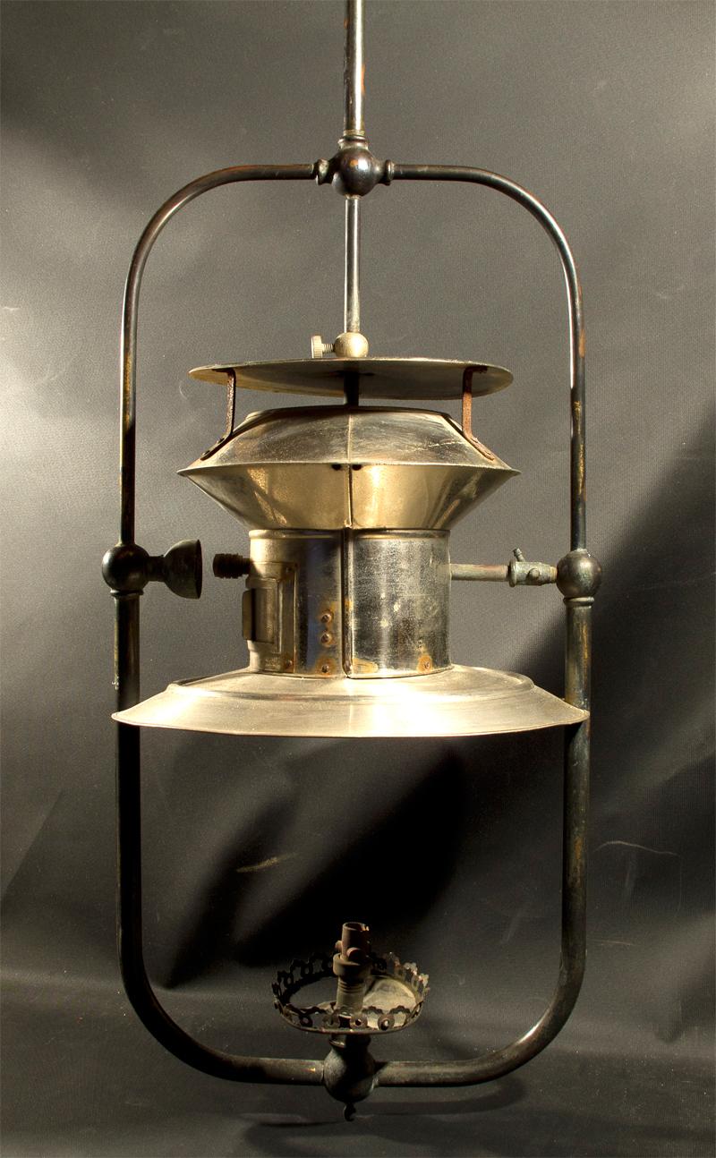 This lamp is somewhat similar to the lamp on page 134 of Kislingbury's "Saloons, Bar, and Cigar Stores" photograph book. The lamp is fed from a gas line out of the top, instead of from a kerosene container at the bottom as shown in Kislingbury's book.