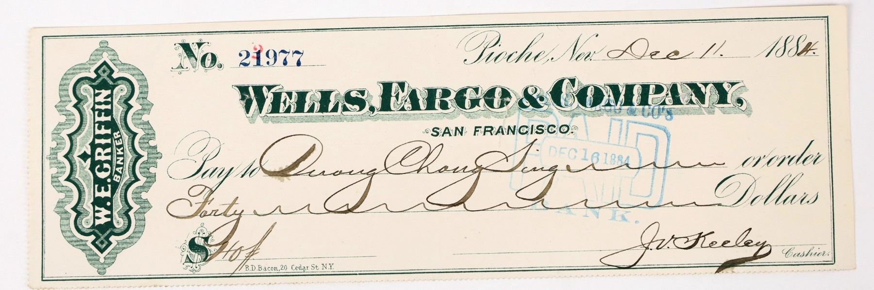 WE Griffin, Banker, Wells Fargo check issued in Pioche in 1884 to Quong Chong Sing for $40. Signed by cashier Keeley. Tough place to get a check from and this is to a Chinese merchant!