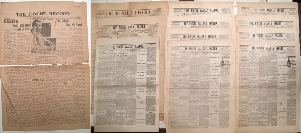 1) The Pioche Weekly Record, 1882-1889. Ten newspapers! Pioche Daily Record, 1876. Three newspapers. 3) Pioche Record, 1915. (Paper torn in half.) As with all old newspapers the paper is very fragile, but the historical value in articles and advertising is tremendous. Due to size, additional shipping fees may be required.