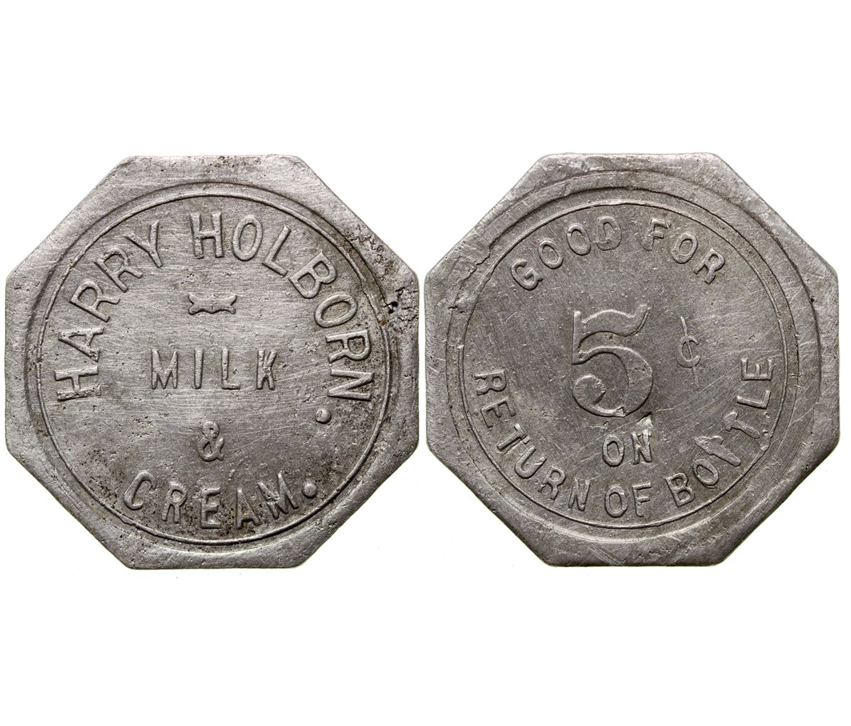 Harry Holborn Milk & Cream/GOOD FOR 5 CENTS ON RETURN OF BOTTLE/Octagonal aluminum 26mm. Unlisted. -60731
