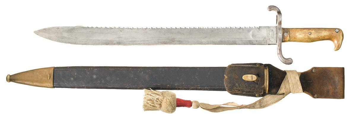 This is a Clemen & Jung Pioneer bayonet for the Mauser Model 71 Rifle. It is a sawback bayonet with "S" shaped quillion, 18 3/4" blade, brass handle, leather scabbard with brass throat and tip and leather frog with a tassel tied to it. The quillion is marked "14.P191".