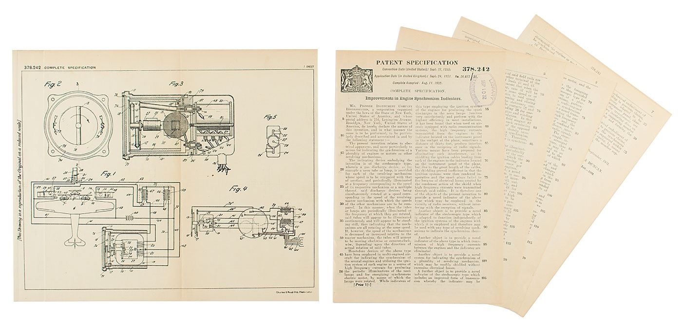 Original linen-backed patent lithograph for the Pioneer Instrument Company's improvements in engine synchronism indicators, one page, 12.5 x 10.25, August 11, 1932. The diagram features multiple views of the improved indicator design, as well as its connection to the aircraft. The top border reads: "378,242 Complete Specification." The lower border features the printed text: "Charles & Read Ltd. Photo-Litho." The left border reads: "This Drawing is a reproduction of the Original on a reduced scale." Includes the printed British "Patent Specification" document, seven pages on four sheets, which describes the invention as a method for reducing interference caused by radio transmissions, in addition to several other objectives. The specification sheet bears a "U.S. Patent Office Library" ink stamp on the first page. In fine condition.
