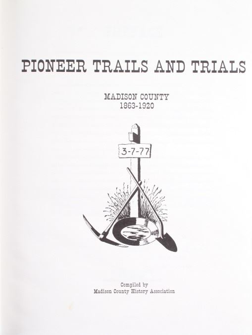 1) "Pioneer Trails and Trials Madison County, Montana" chronicling the lives of pioneers from 1863-1920, compiled by Madison County History Association, Bicentennial Edition Copyright 1976 Madison County History Association Printed by Blue Print & Letter Company Great Falls, Montana; next is featured a companion book,